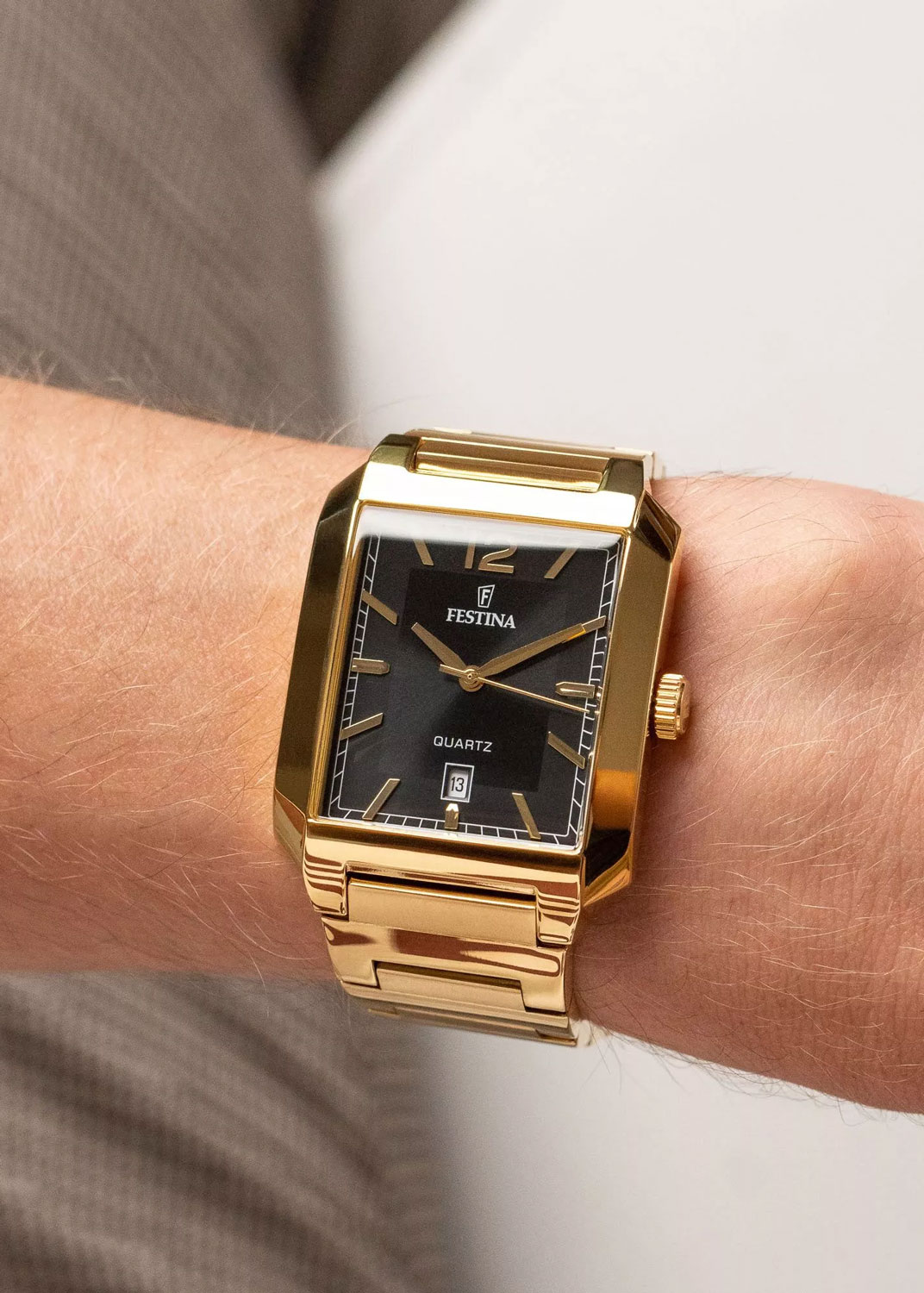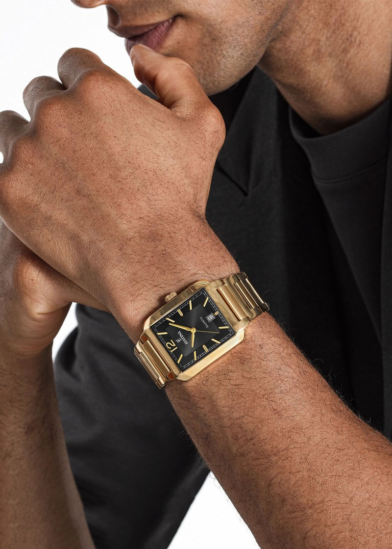 Мужские наручные часы. Прямоугольный стальной корпус. Циферблат выполнен по технологии Sunray (солнечные лучи) и защищен минеральным стеклом. Метки в виде штрихов и арабской цифры 12. Окошко даты находится в положении 6 часов. Рифленая заводная головка. Стальной браслет с раскладывающейся застежкой.