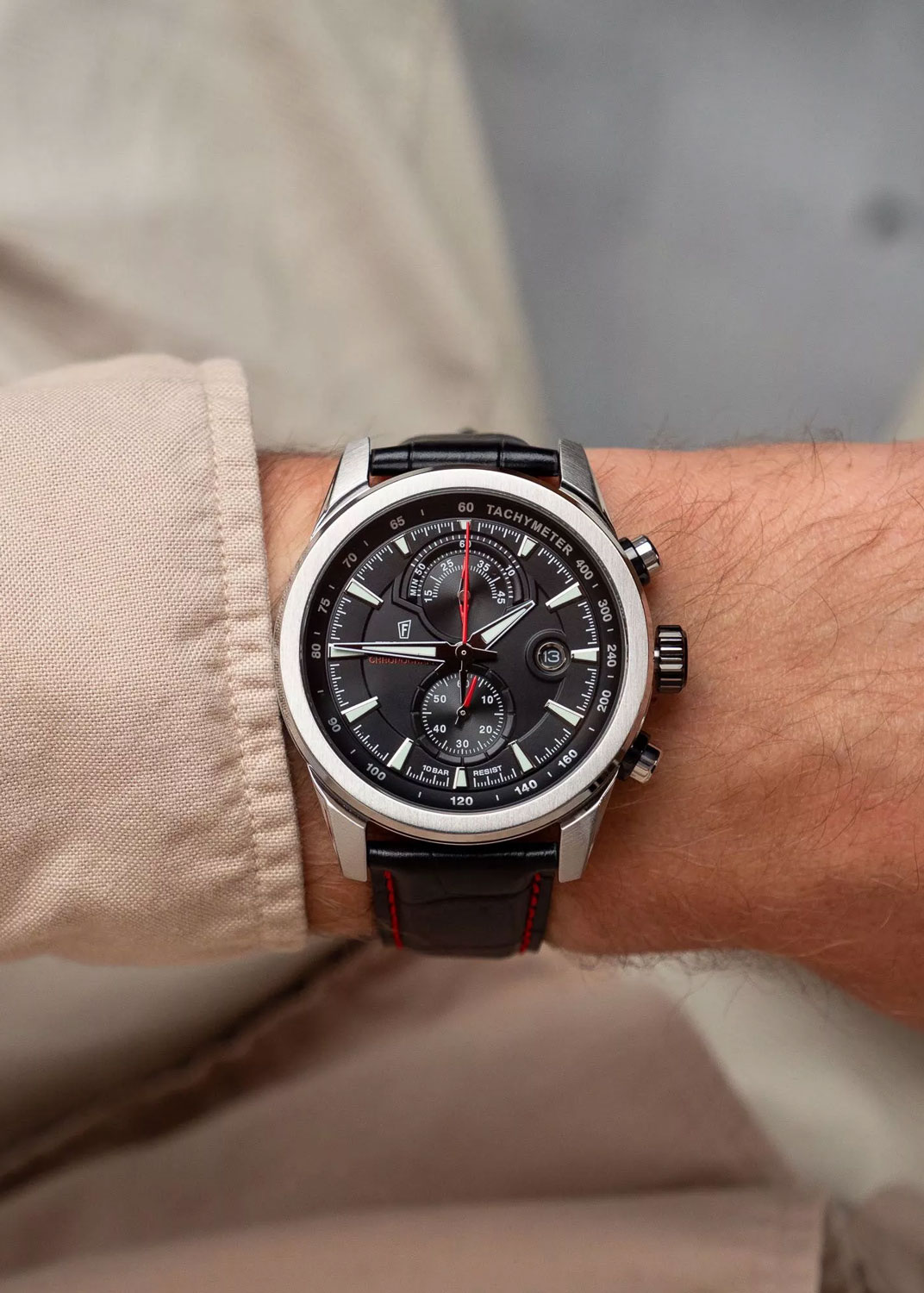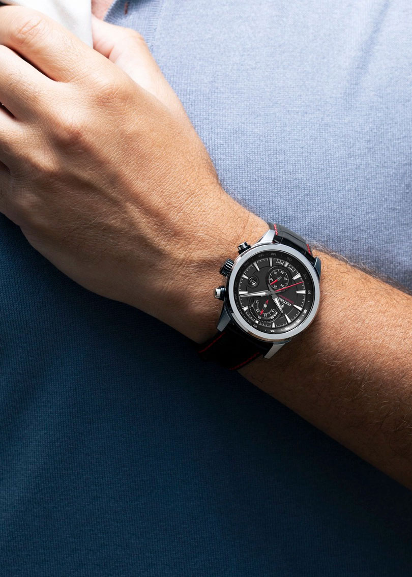 Мужские наручные часы-хронограф с секундомером и тахиметром. Круглый корпус из нержавеющей стали с матовой и полированной обработкой. Кварцевый механизм. Циферблат с метками в виде штрихов. Мечевидные стрелки в стиле Sword. Метки и стрелки с люминесцентным покрытием, которое светится в темноте после непродолжительной зарядки на свету.