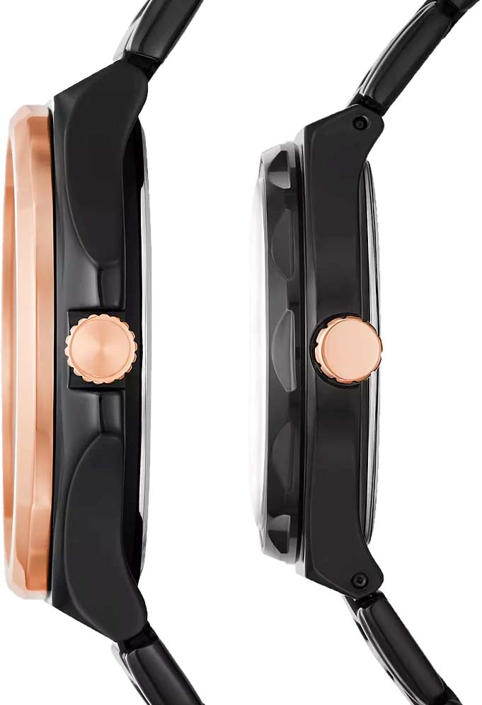 Практичные аксессуары с дополнительными функциями идеальны для современного ритма жизни. Подарочный набор часов His and Her. Мужская модель со стальным корпусом. Циферблат с метками в виде штрихов. Дата и день недели отображаются на отдельных циферблатах. Рифленая заводная головка с защитой. Надежный стальной браслет с раскладывающейся застежкой. Женская модель с круглым стальным корпусом. Безель инкрустирован кристаллами. Циферблат с метками в виде штрихов и арабской цифры 12. Функции даты, дня недели и 24-часового формата времени вынесены на отдельные циферблаты. Рифленая заводная головка. Стальной браслет с раскладывающейся застежкой.