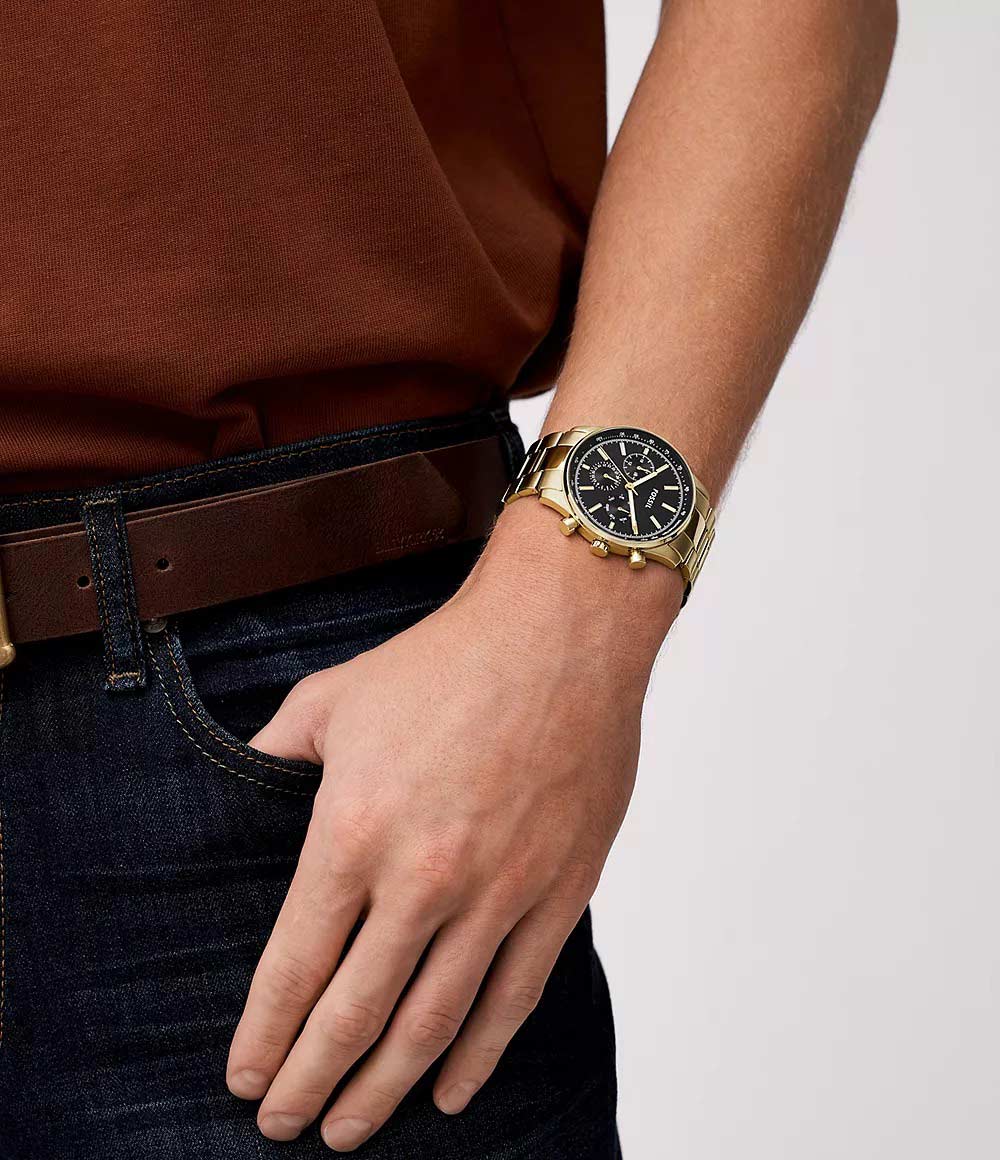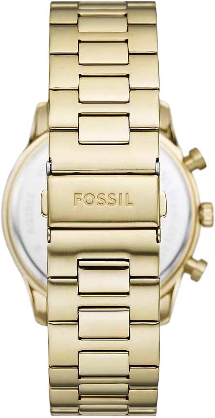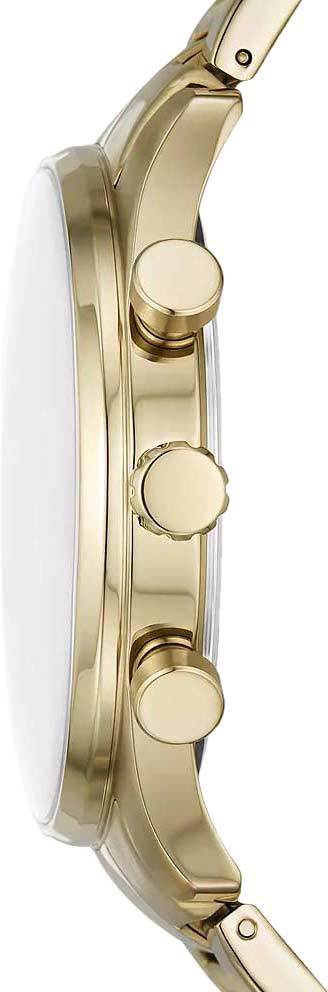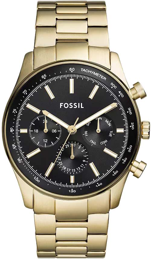 Время в 24-х часовом формате, дата и день недели вынесены на отдельные циферблаты. Рифленая заводная головка. Браслет с раскладывающейся застежкой.