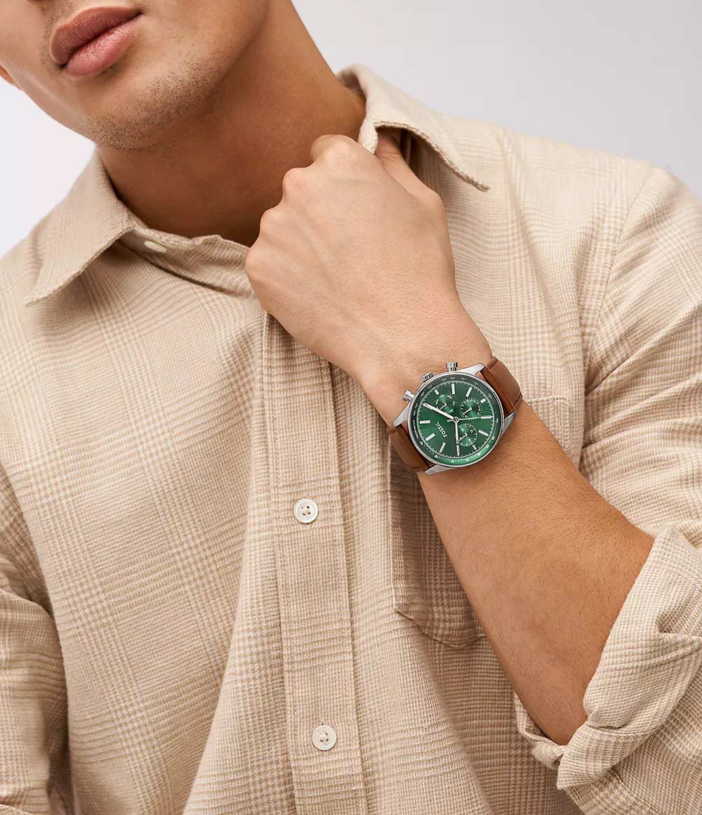 Время в 24-х часовом формате, дата и день недели вынесены на отдельные циферблаты. Рифленая заводная головка. Фирменный кожаный ремешок LiteHide с классической застежкой.