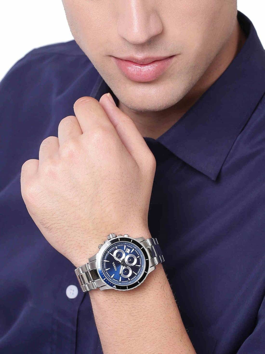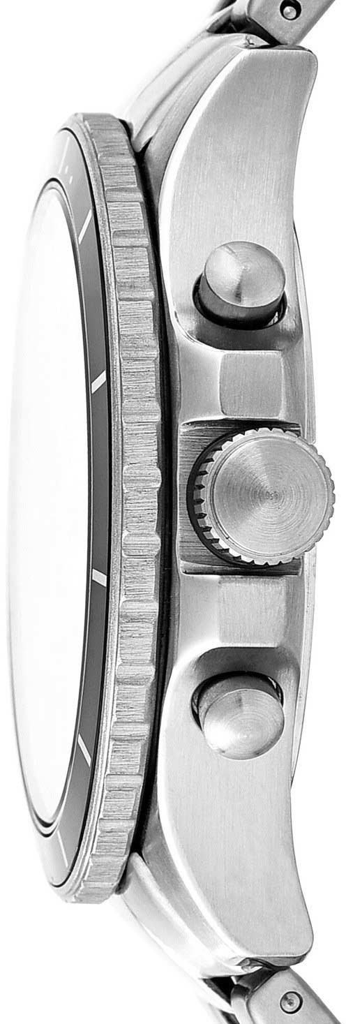 Часы-хронограф с секундомером. 12-ти и 24-х часовой формат времени. Круглый стальной корпус. Циферблат выполнен по технологии Sunray (солнечные лучи). Метки в виде штрихов. Окошко даты находится между отметками 4 и 5 часов. Рифленая заводная головка с защитой. Завинчивающаяся задняя крышка. Браслет с раскладывающейся застежкой.