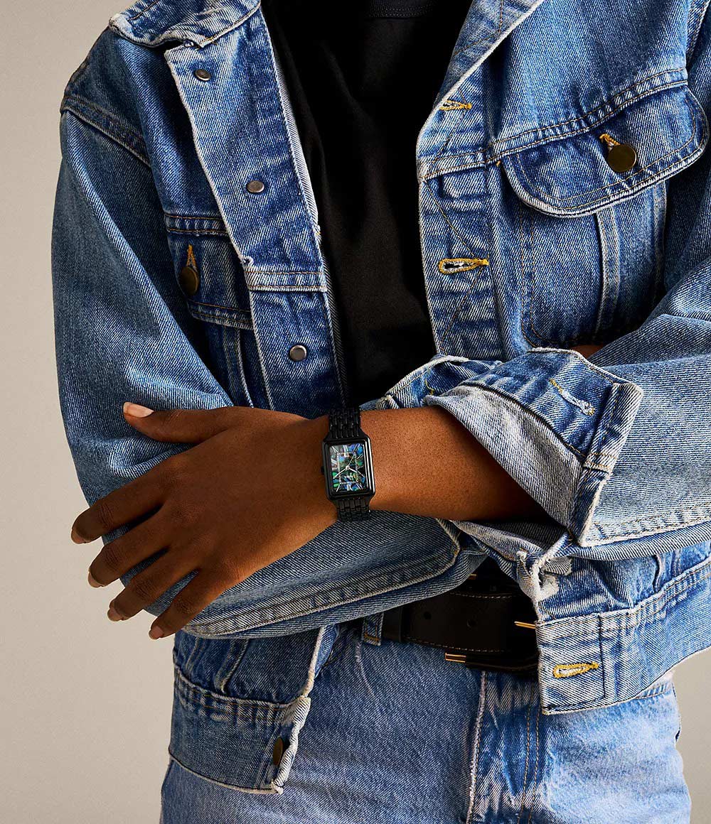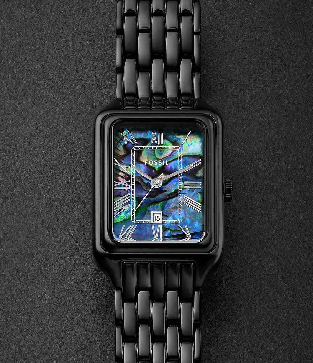 Женские наручные часы. Прямоугольный стальной корпус. Циферблат из ракушки Абалона. Метки в виде римских цифр. Окошко даты находится в положении 6 часов. Рифленая заводная головка. Браслет с раскладывающейся застежкой.