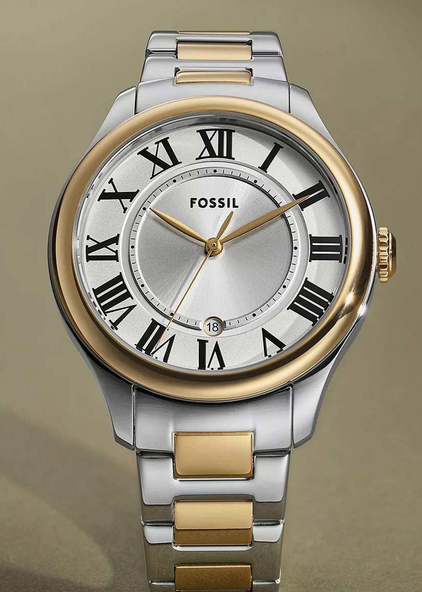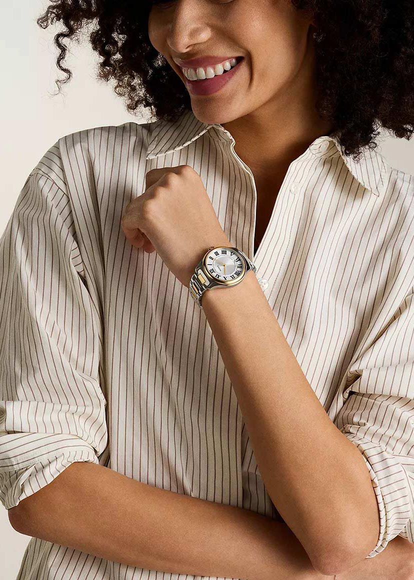 Женские наручные часы. Круглый стальной корпус. Двухцветный циферблат в центре выполнен по технологии Sunray (солнечные лучи). Метки в виде римских цифр. Окошко даты находится в положении 6 часов. Рифленая заводная головка. Надежный стальной браслет с раскладывающейся застежкой.