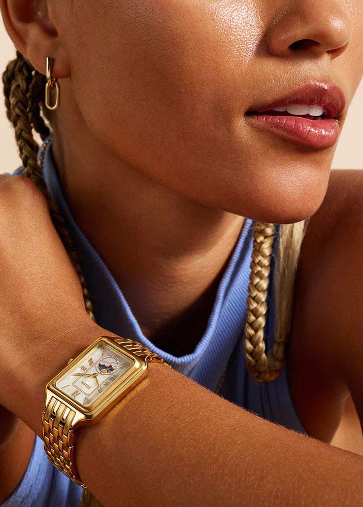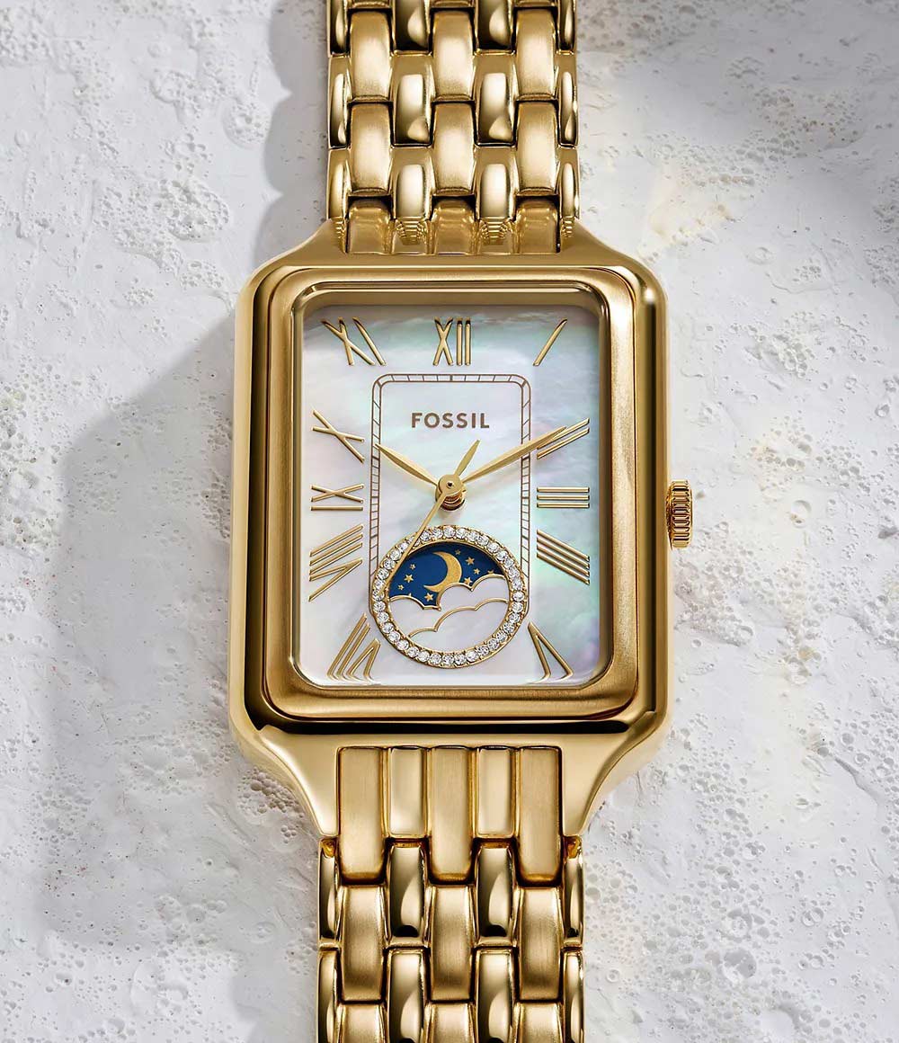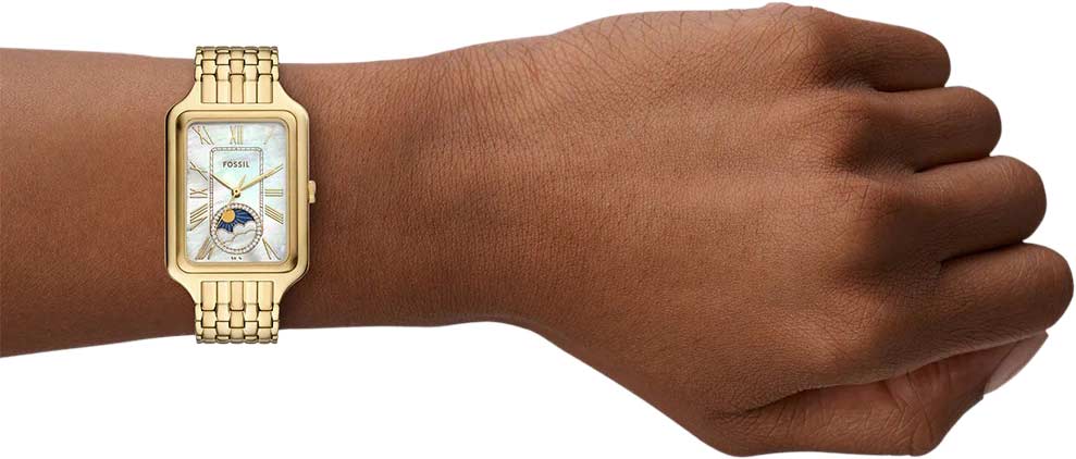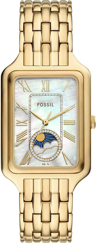Женские наручные часы Raquel Sun Moon. Прямоугольный стальной корпус. Перламутровый циферблат с метками в виде римских цифр. На отдельный циферблат вынесен индикатор фаз Луны. Рифленая заводная головка. Браслет с раскладывающейся застежкой.
