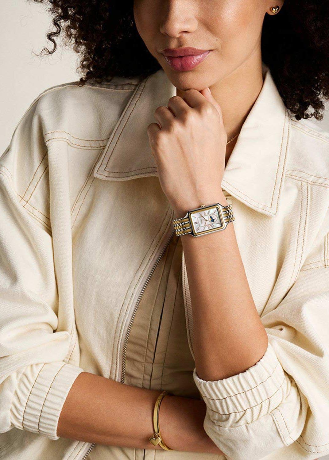 Женские наручные часы Raquel Sun Moon. Прямоугольный стальной корпус. Перламутровый циферблат с метками в виде римских цифр. На отдельный циферблат вынесен индикатор фаз Луны. Рифленая заводная головка. Браслет с раскладывающейся застежкой.