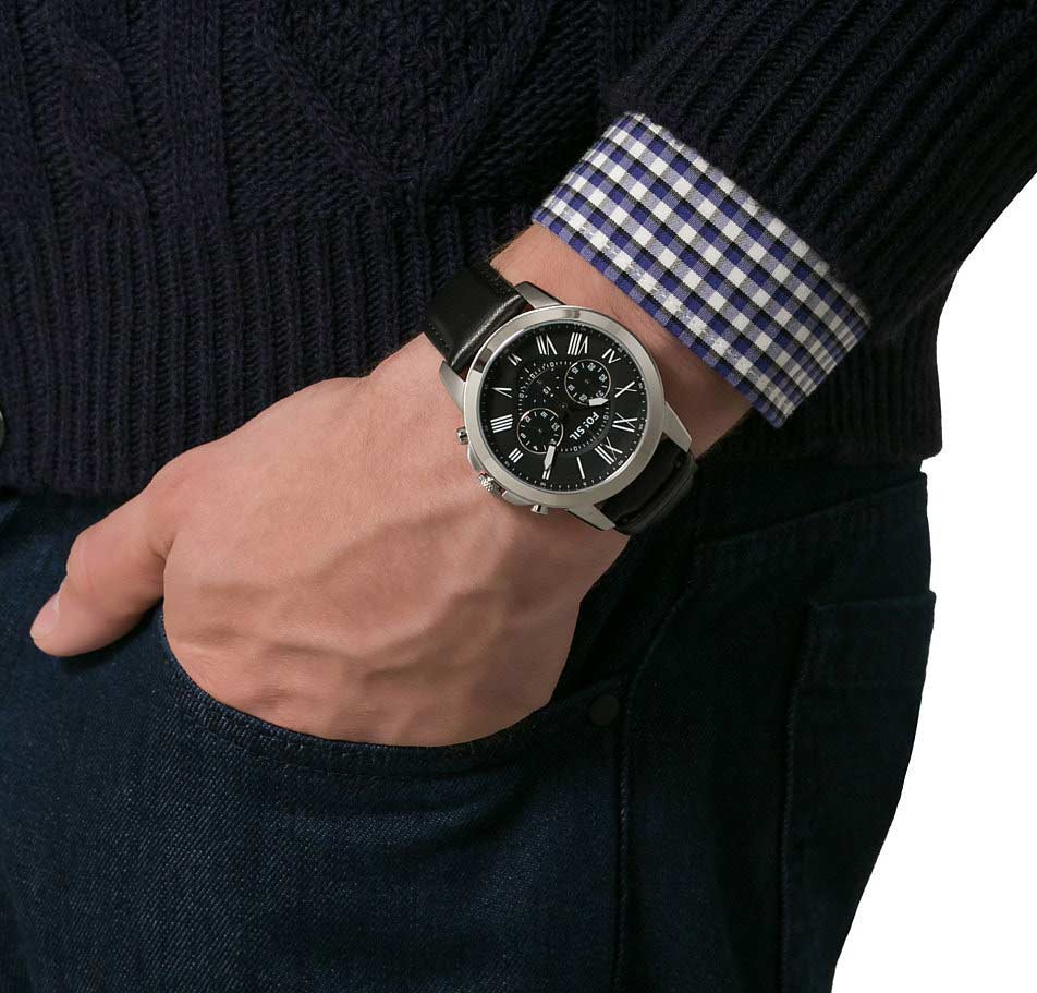 Выполненный в классическом стиле аксессуар отлично подойдет для повседневного общения со временем. Grant Chronograph Leather Watch - Black. Часы-хронограф с секундомером. Круглый стальной корпус. 12-ти и 24-х часовой формат времени. Циферблат с метками в виде римских цифр. Рифленая заводная головка с защитой. Кожаный ремешок с классической застежкой.