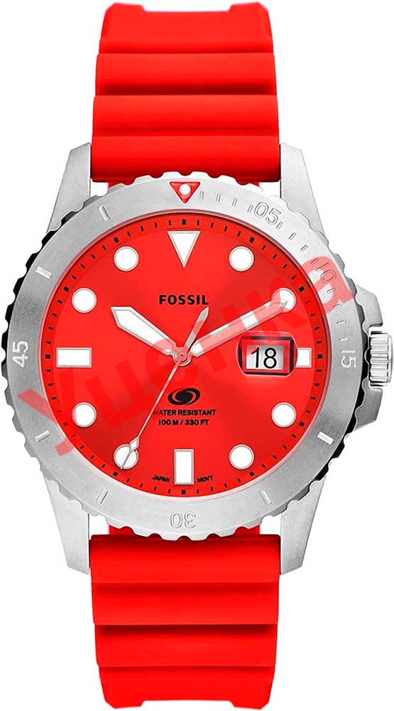 Мужские часы в круглом корпусе Fossil Blue Dive. Метки в виде точек и штрихов. Окошко даты с увеличительным стеклом находится в положении 3 часа. Рифленая заводная головка с защитой. Силиконовый ремешок с классической застежкой.