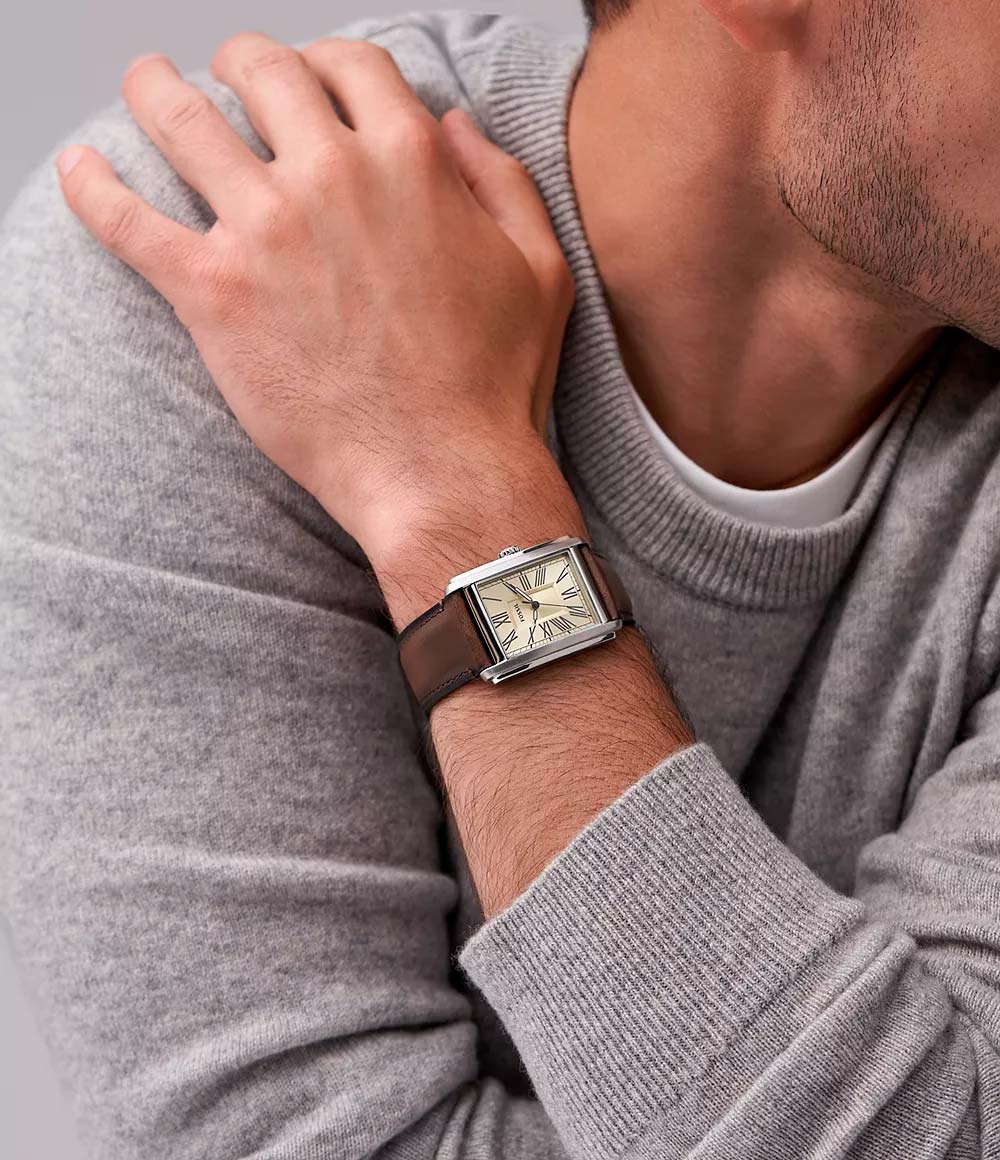 Классический и продуманный до мельчайших деталей, этот аксессуар идеален для современного ритма жизни. Мужские наручные часы. Прямоугольный стальной корпус. Циферблат выполнен по технологии Sunray (солнечные лучи). Метки в виде римских цифр. Рифленая заводная головка. Удобный кожаный ремешок.