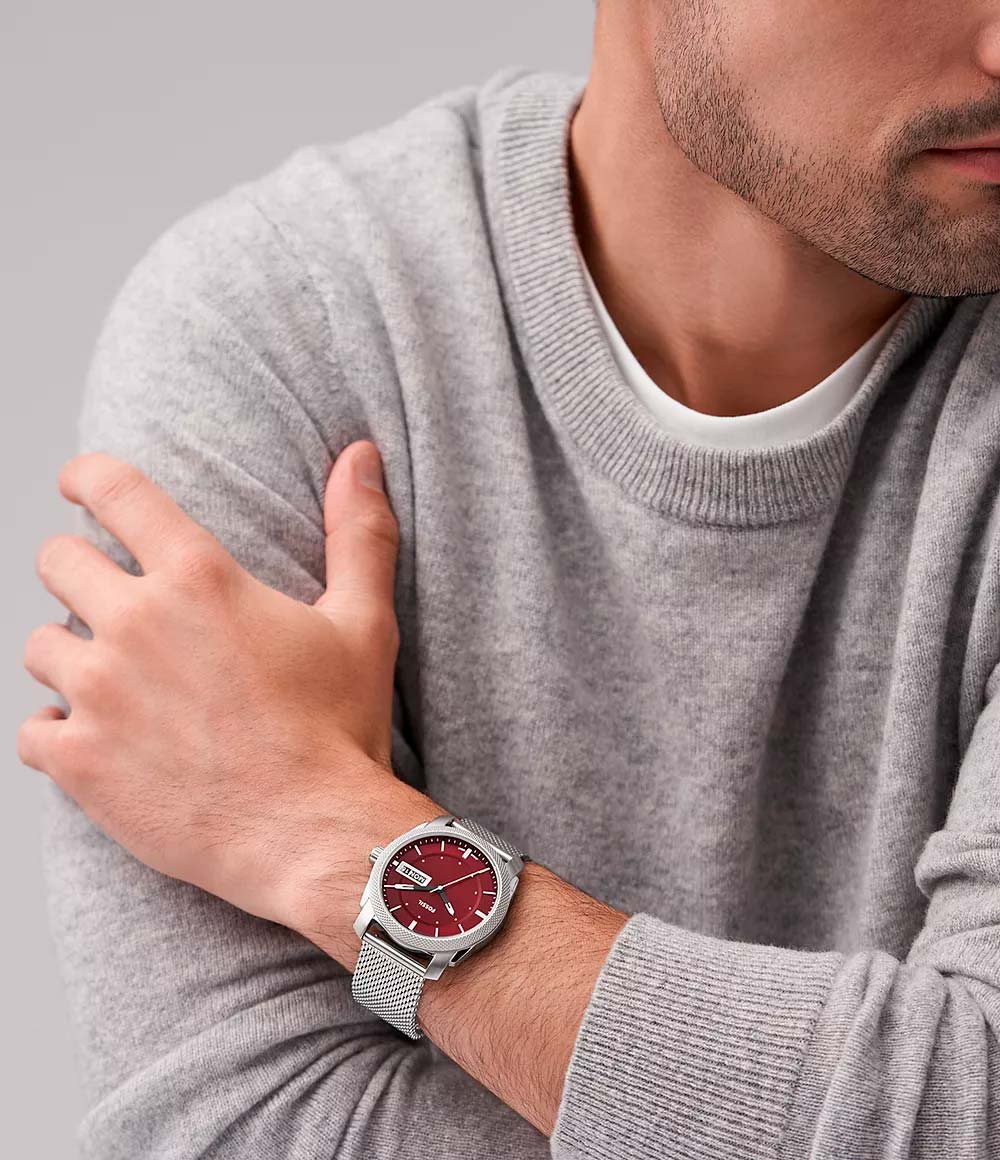 Практичный и функциональный аксессуар идеален для современного ритма жизни. Повседневные мужские наручные часы. Круглый стальной корпус с минеральным стеклом. Рифленый безель. Заостренные прямоугольные стрелки в стиле Baton. Метки в виде штрихов. Метки и стрелки с люминесцентным покрытием, которое светится в темноте после непродолжительной зарядки на свету. Двойное окошко даты и дня недели находится в положении 3 часа. Рифленая заводная головка. Завинчивающаяся задняя крышка. Надежный стальной браслет миланского плетения.