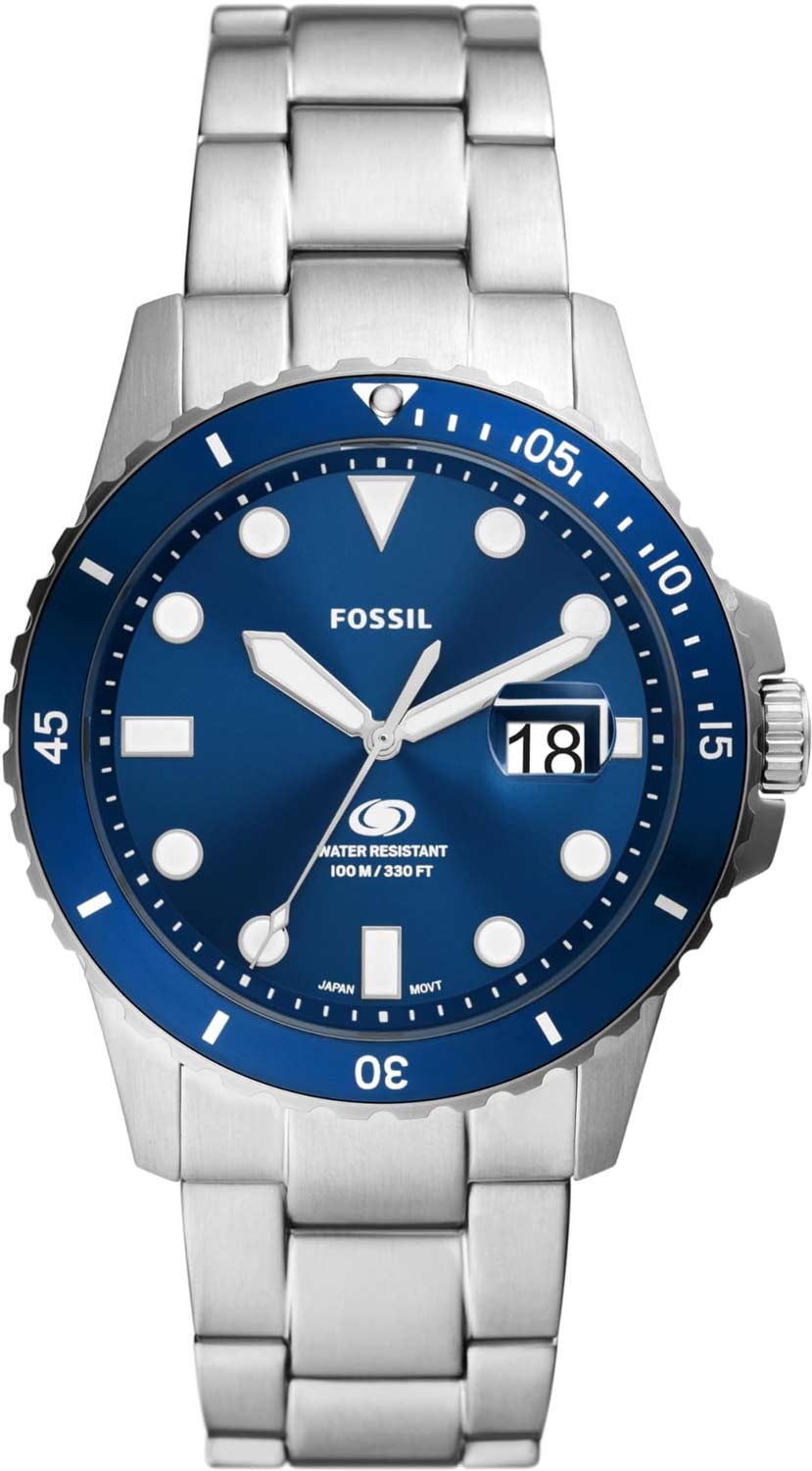 Стильный дизайн и функциональность - выбор мужчины, который стремится к достижению новых целей. Водонепроницаемые мужские наручные часы Fossil Blue Dive. Круглый стальной корпус с минеральным стеклом. Рифленый безель с минутной шкалой. Циферблат выполнен по технологии Sunray (солнечные лучи). Мечевидные стрелки в стиле Sword. Метки в виде штрихов и точек, 12-ти часовая метка в виде треугольника. Метки и стрелки с люминесцентным покрытием, которое светится в темноте после непродолжительной зарядки на свету. Окошко даты с увеличительным стеклом находится в положении 3 часа. Рифленая заводная головка с защитой. Завинчивающаяся задняя крышка. Удобный и надежный стальной браслет с раскладывающейся застежкой.
