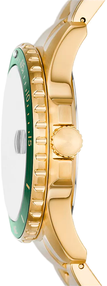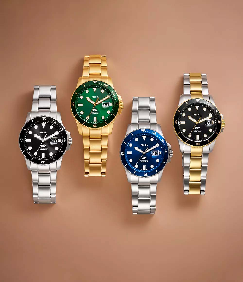 Удобные и надежные дайверские часы для сильных мужчин. Будьте уверены, они вас не подведут! Мужские часы в круглом корпусе Fossil Blue Dive. Циферблат выполнен по технологии Sunray (солнечные лучи). Метки в виде точек и штрихов. Окошко даты с увеличительным стеклом находится в положении 3 часа. Рифленая заводная головка с защитой. Стальной браслет с раскладывающейся застежкой.