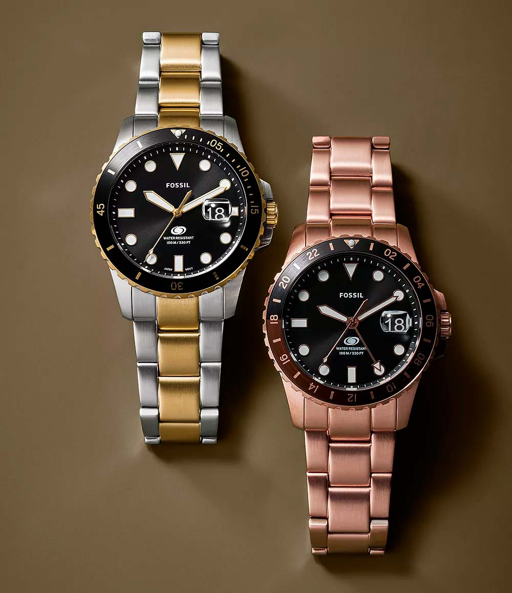Удобные и надежные дайверские часы для сильных мужчин. Будьте уверены, они вас не подведут! Мужские часы в круглом корпусе Fossil Blue Dive. Циферблат выполнен по технологии Sunray (солнечные лучи). Метки в виде точек и штрихов. Окошко даты с увеличительным стеклом находится в положении 3 часа. Рифленая заводная головка с защитой. Стальной браслет с раскладывающейся застежкой.