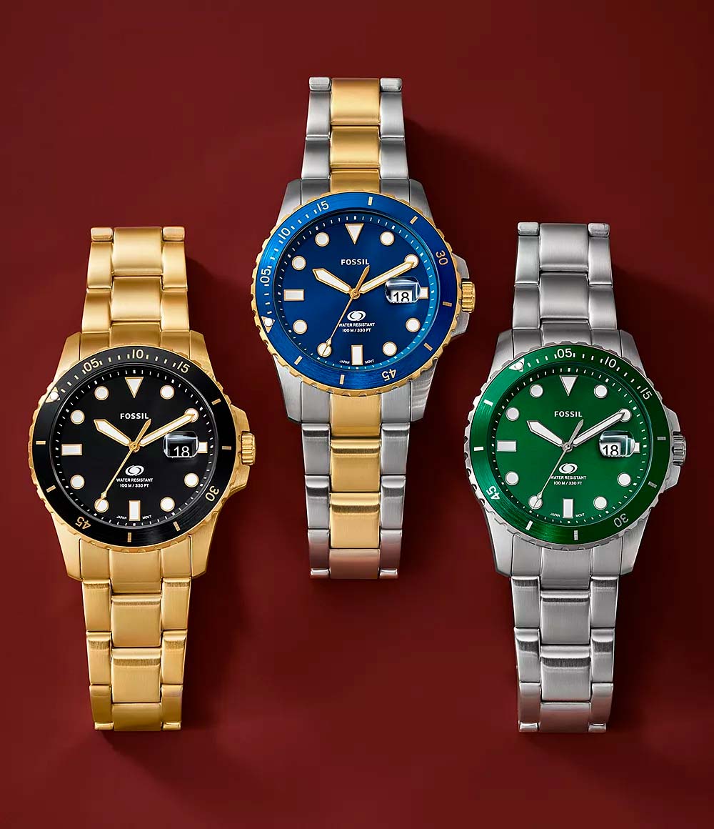 Удобные и надежные дайверские часы для сильных мужчин. Будьте уверены, они вас не подведут! Мужские часы в круглом корпусе Fossil Blue Dive. Циферблат выполнен по технологии Sunray (солнечные лучи). Метки в виде точек и штрихов. Окошко даты с увеличительным стеклом находится в положении 3 часа. Рифленая заводная головка с защитой. Стальной браслет с раскладывающейся застежкой.