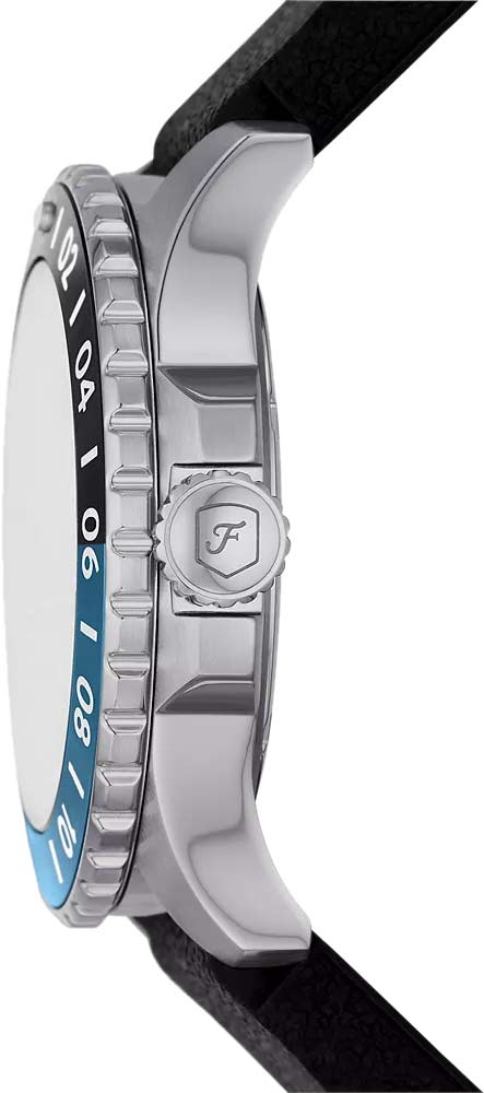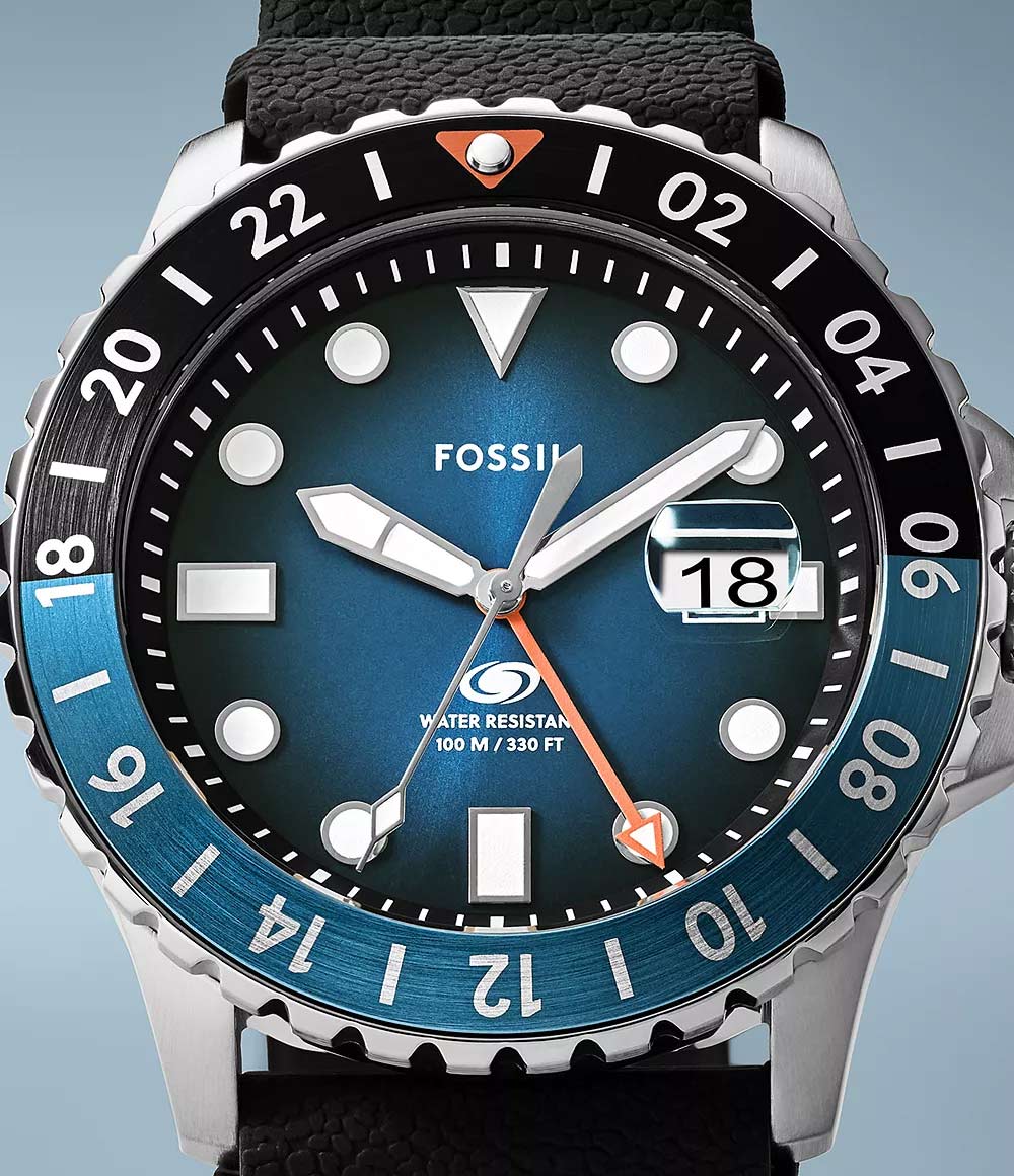 Стильный дизайн аксессуара и функциональность - выбор мужчины, который стремится к достижению новых целей. Водонепроницаемые наручные часы Fossil Blue GMT. Круглый стальной корпус. Рифленый безель. Второй часовой пояс в 24-х часовом формате времени отображается центральной стрелкой. Циферблат выполнен по технологии Sunray (солнечные лучи). Метки в виде штрихов и точек, 12-ти часовая метка в виде треугольника. Окошко даты с увеличительным стеклом находится в положении 3 часа. Рифленая заводная головка с защитой. Силиконовый ремешок с классической застежкой.