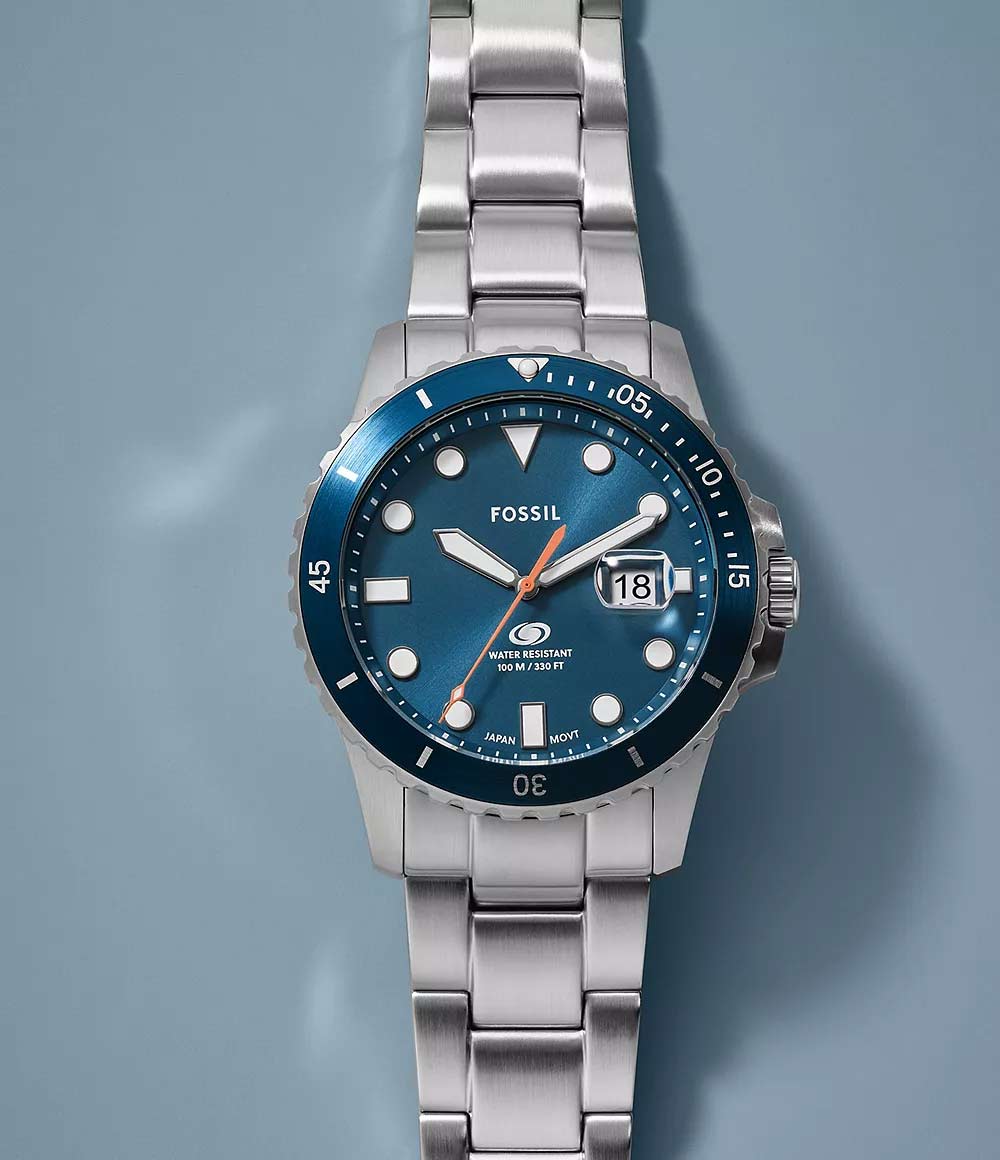 Стильный дизайн аксессуара и функциональность - выбор мужчины, который стремится к достижению новых целей. Водонепроницаемые наручные часы Fossil Blue Dive. Круглый стальной корпус. Рифленый безель с минутной шкалой. Циферблат выполнен по технологии Sunray (солнечные лучи). Метки в виде штрихов и точек, 12-ти часовая метка в виде треугольника. Окошко даты с увеличительным стеклом находится в положении 3 часа. Рифленая заводная головка с защитой. Завинчивающаяся задняя крышка. Удобный и надежный стальной браслет с раскладывающейся застежкой.