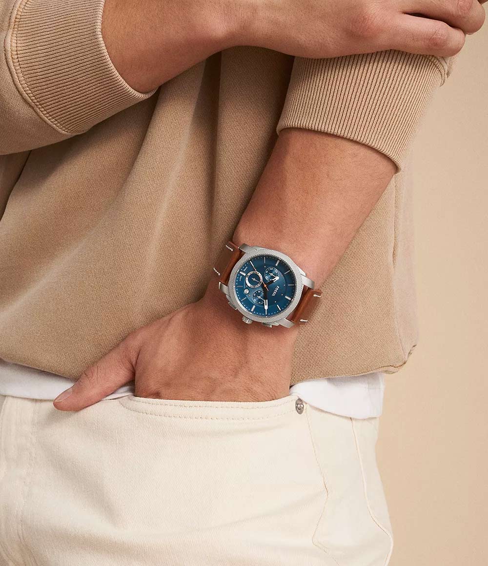 Стильный аксессуар для сильного и уверенного в себе мужчины. Часы-хронограф с секундомером. Круглый стальной корпус. Фактурный безель. 12-ти и 24-х часовой формат времени. Циферблат выполнен по технологии Sunray (солнечные лучи). Метки в виде штрихов. Окошко даты находится между метками 4 и 5 часов. Рифленая заводная головка. Кожаный ремешок с классической застежкой.