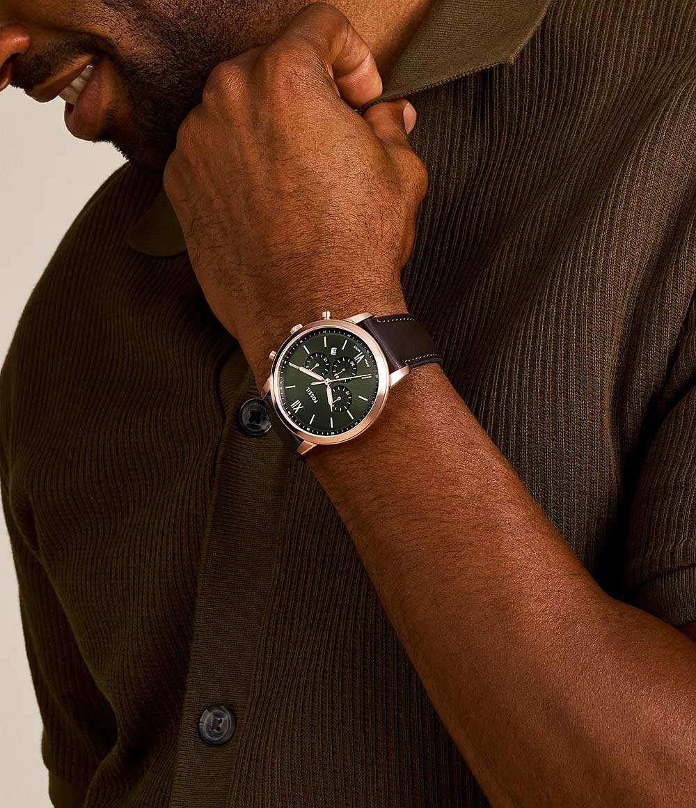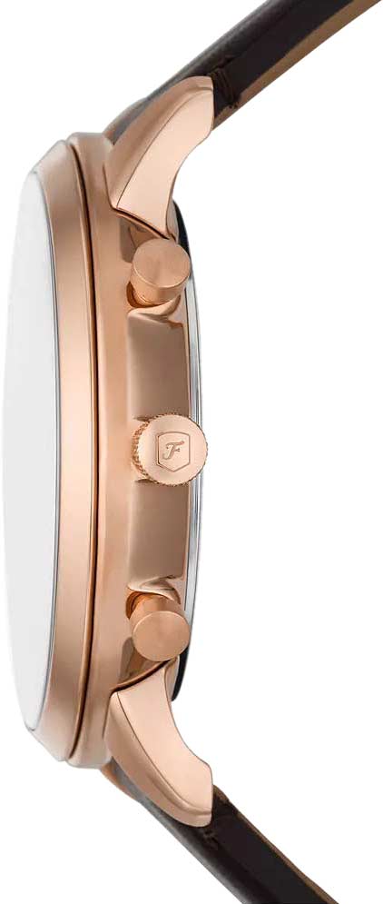 Мужские часы-хронограф с секундомером. 12-ти и 24-х часовой формат времени. Циферблат выполнен по технологии Sunray (солнечные лучи). Метки в виде штрихов и римских цифр VI и XII. Окошко даты находится между метками 4 и 5 часов. Рифленая заводная головка. Кожаный ремешок с классической застежкой.