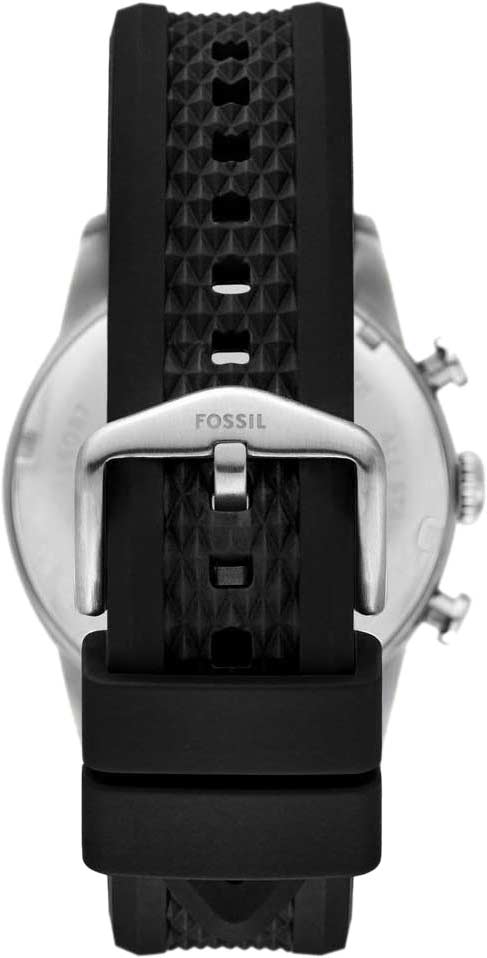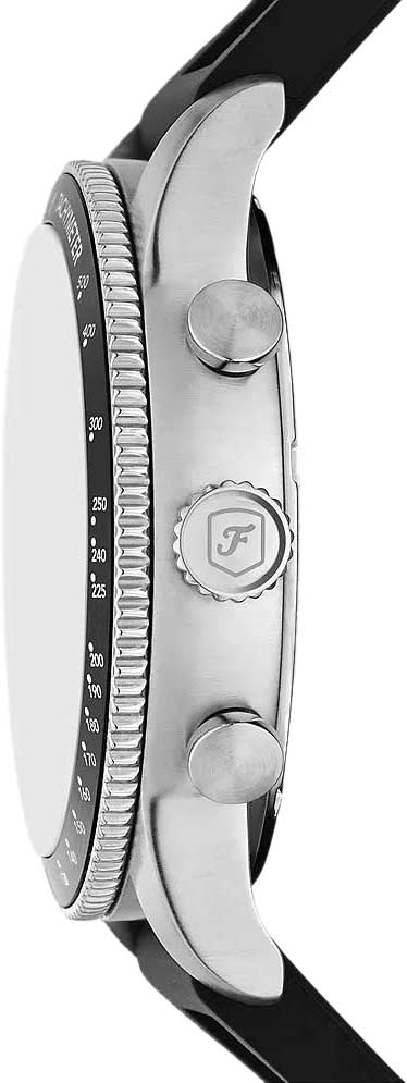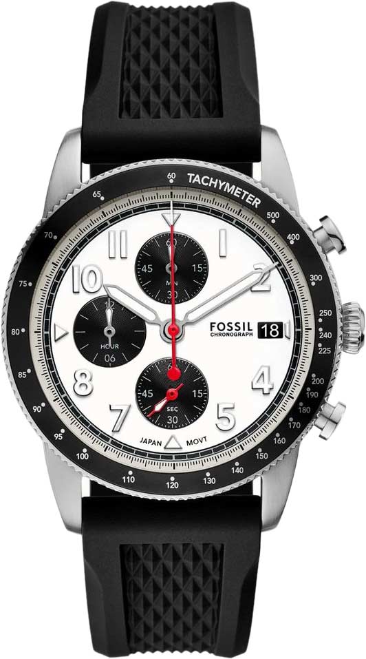 Часы-хронограф с секундомером. Круглый стальной корпус. Рифленый безель с тахиметрической шкалой. Метки в виде арабских цифр и треугольников. Окошко даты находится в положении 3 часа. Рифленая заводная головка. Завинчивающаяся задняя крышка. Силиконовый ремешок с классической застежкой.