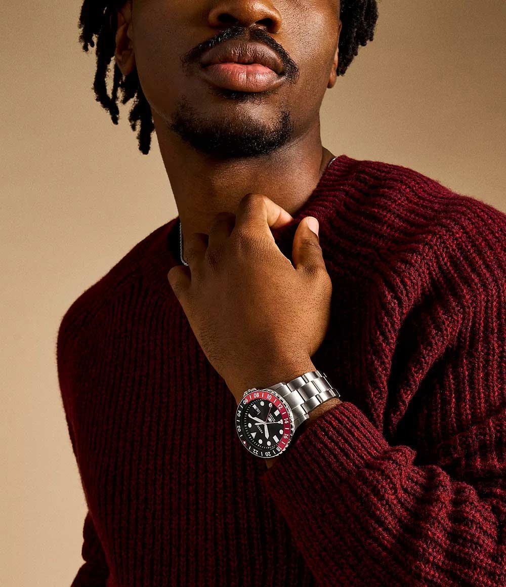 Водонепроницаемые наручные часы Blue GMT. Круглый стальной корпус. Рифленый вращающийся безель. Второй часовой пояс в 24-х часовом формате времени отображается центральной стрелкой. Циферблат выполнен по технологии Sunray (солнечные лучи).