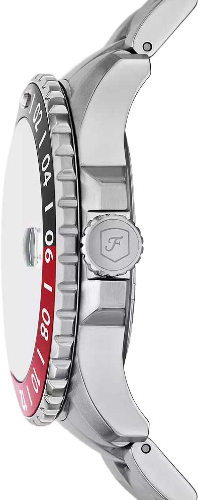 Метки в виде штрихов и точек, 12-ти часовая метка в виде треугольника. Окошко даты с увеличительным стеклом находится в положении 3 часа. Рифленая заводная головка с защитой. Завинчивающаяся задняя крышка. Стальной браслет с раскладывающейся застежкой.