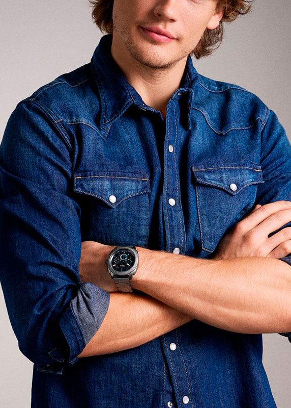 Мужские часы-хронограф Machine с секундомером. 12-ти и 24-х часовой формат времени. Стальной корпус. Рифленый безель. Метки в виде штрихов. Метки и стрелки с люминесцентным покрытием, которое светится в темноте после непродолжительной зарядки на свету. Рифленая заводная головка. Стальной браслет с раскладывающейся застежкой.