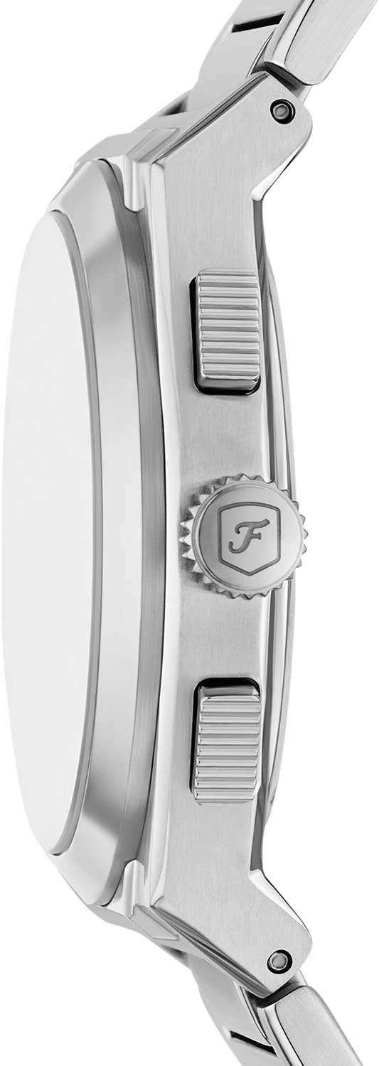 Мужские часы-хронограф с секундомером. 12-ти и 24-х часовой формат времени. Стальной корпус. Гильошированный циферблат выполнен по технологии Sunray (солнечные лучи). Метки в виде штрихов. Рифленая заводная головка. Браслет с раскладывающейся застежкой.