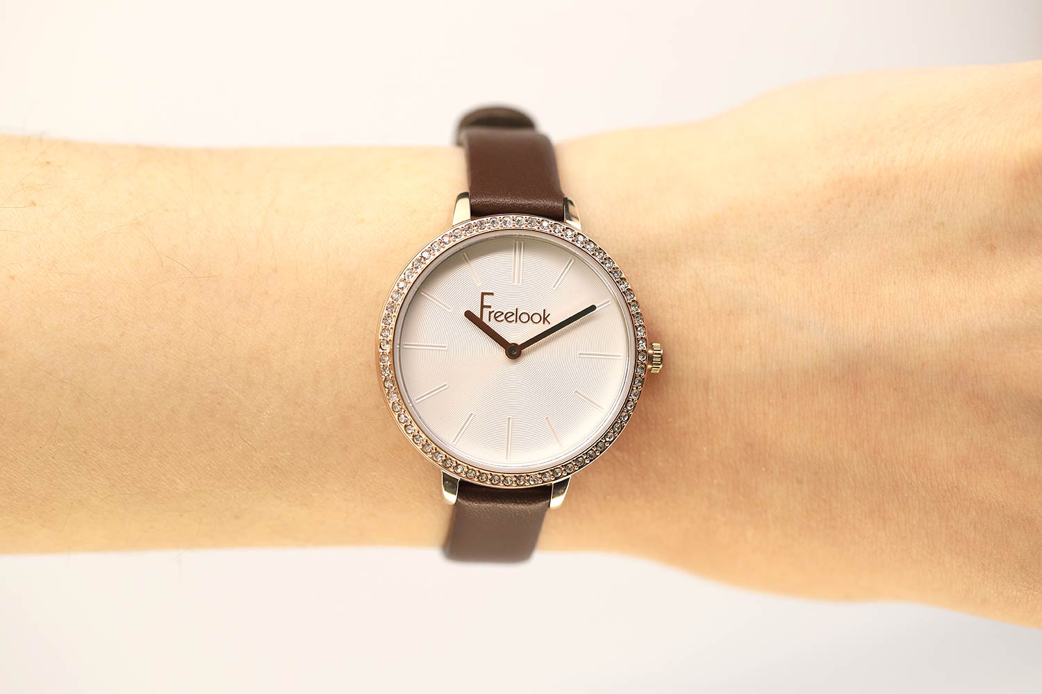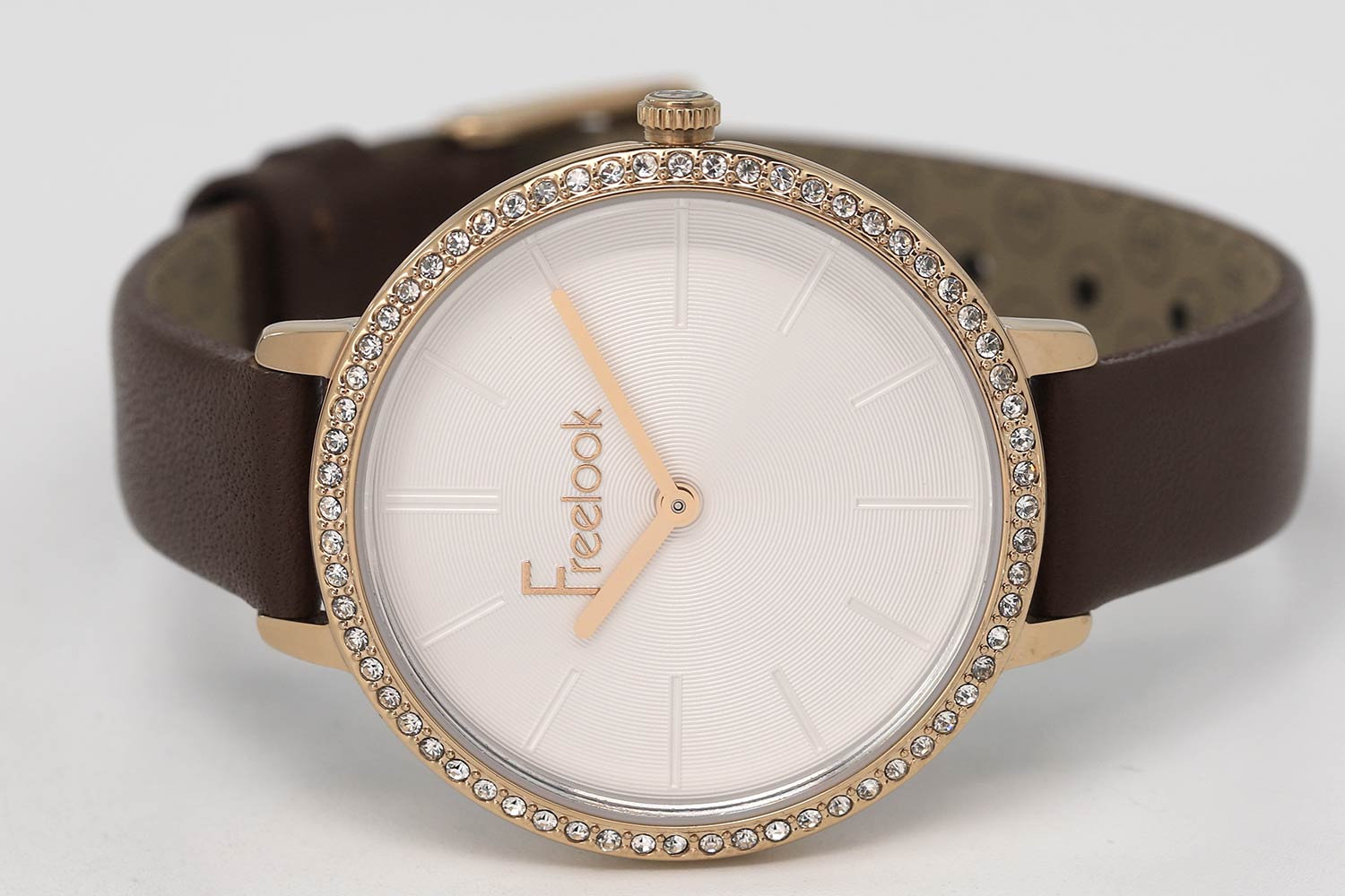 Изящные женские часы с надежным японским механизмом и кожаным ремешком подчеркнут утонченность своей обладательницы. Lumiere. Круглый полированный корпус с безелем, аккуратно дополненным паве из кристаллов Swarovski. Циферблат украшен рельефным декоративным узором в виде концентрических окружностей. Закругленные прямоугольные стрелки. Метки в виде штрихов. Удобный ремешок из натуральной кожи с классической застежкой. Циферблат и рифленая заводная головка украшены фирменным логотипом Freelook.