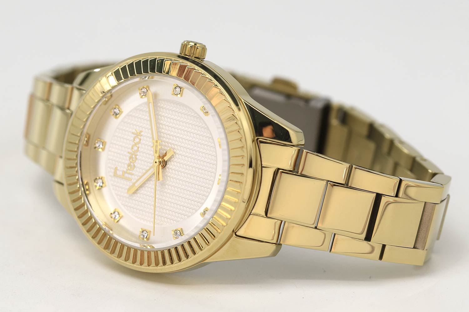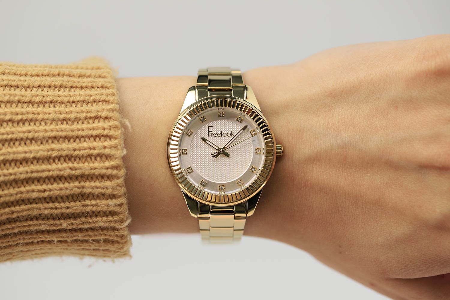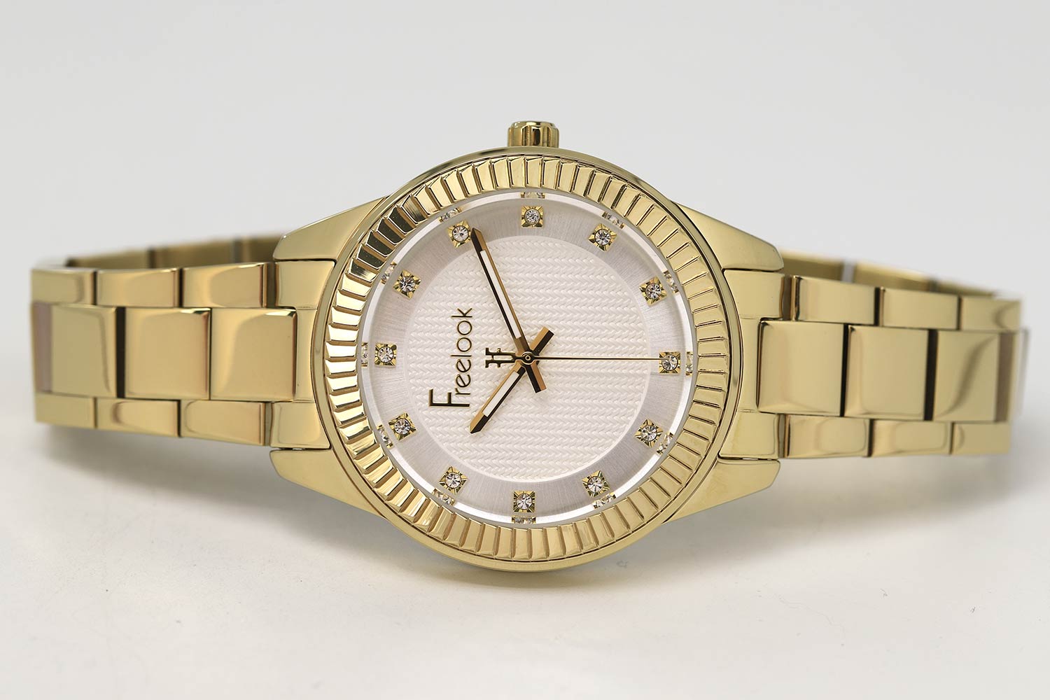 Внешний вид этих часов, украшенных кристаллами Swarovski, захватывает дух. Подарите себе этот шедевр часового искусства. Belle. Долговечный японский кварцевый механизм и модный циферблат надежно защищены круглым полированным корпусом с минеральным стеклом. Рифленый безель. Циферблат в центральной части украшен паттерном, имитирующим плетение. Заостренные прямоугольные стрелки с люминесцентным покрытием, которое светится в темноте после непродолжительной зарядки на свету. Метки в виде точек выполнены из кристаллов Swarovski. Надежный стальной браслет с раскладывающейся застежкой. Циферблат, секундная стрелка, рифленая заводная головка и застежка украшены фирменным логотипом Freelook.