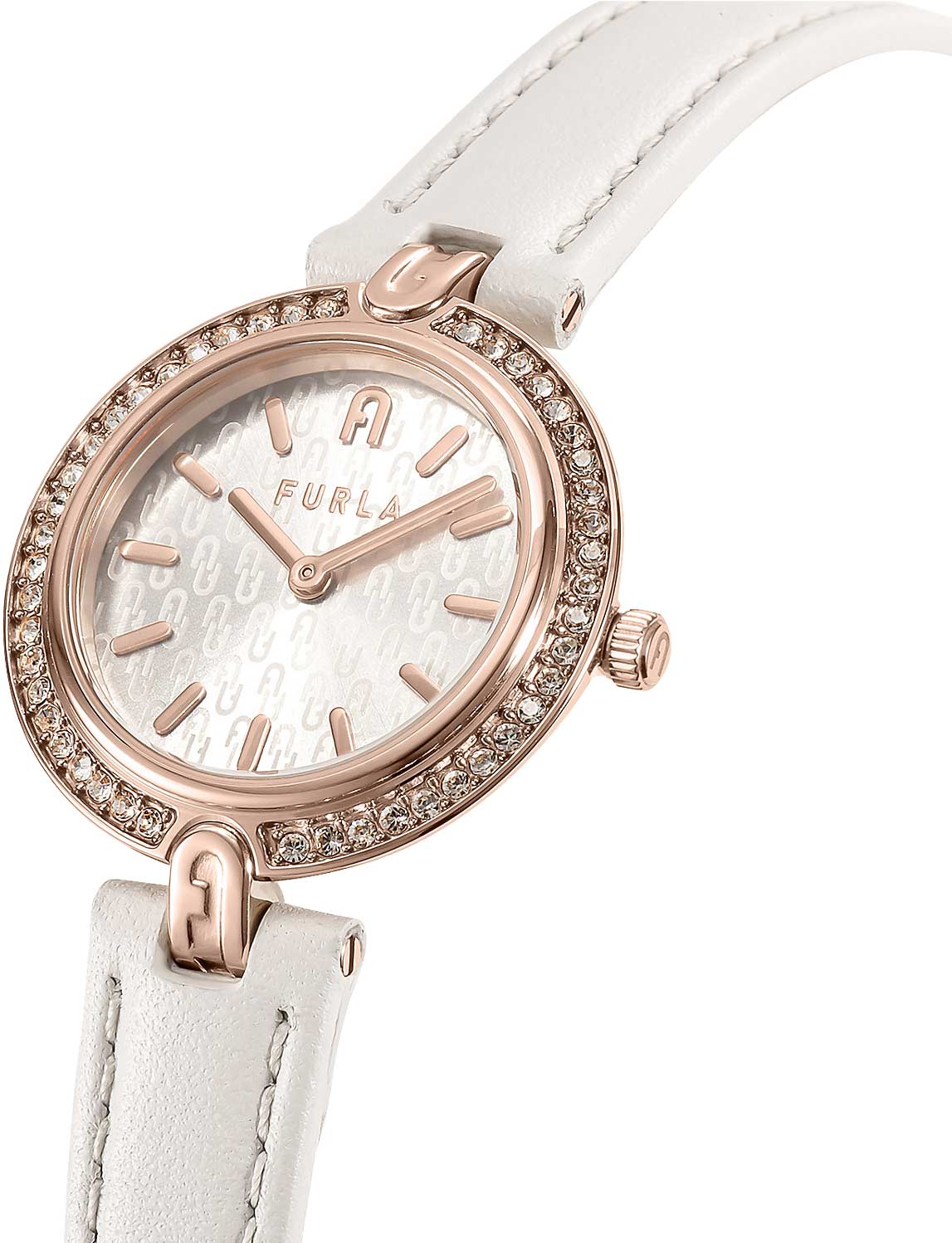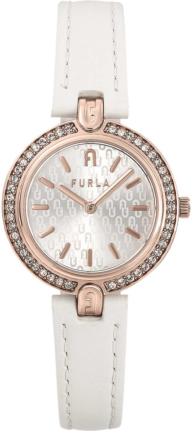 Привлекательные наручные часы для женщин. Круглый скошенный корпус. Безель инкрустирован кристаллами. Циферблат выполнен по технологии Sunray (солнечные лучи) и украшен логотипом. Метки в виде штрихов с фирменной аркой в положении 12 часов. Закругленные стрелки. Рифленая заводная головка. Арочные формы на ушках крепления ремешка. Ремешок из натуральной итальянской кожи. Классическая застежка с логотипом Furla. В комплекте дизайнерский браслет.