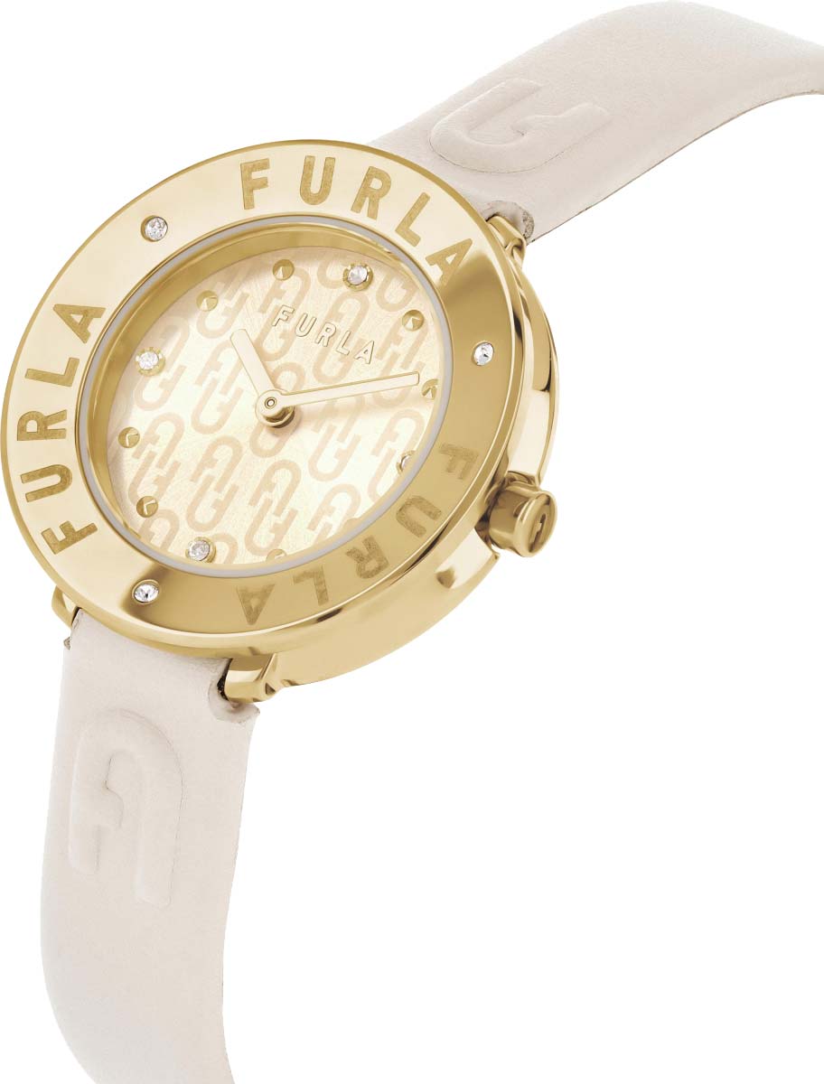 Дизайнерские наручные часы. Круглый стальной корпус. Безель с гравировками логотипа и тремя кристаллами. Циферблат с накладными метками в виде точек выполнен по технологии Sunray (солнечные лучи). Закругленные прямоугольные стрелки в стиле Baton. Заводная головка украшена фирменной аркой Furla. Кожаный ремешок с классической застежкой.