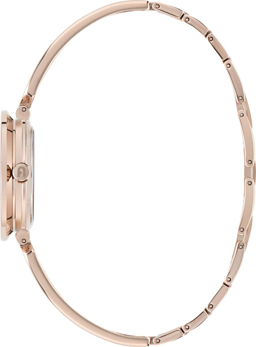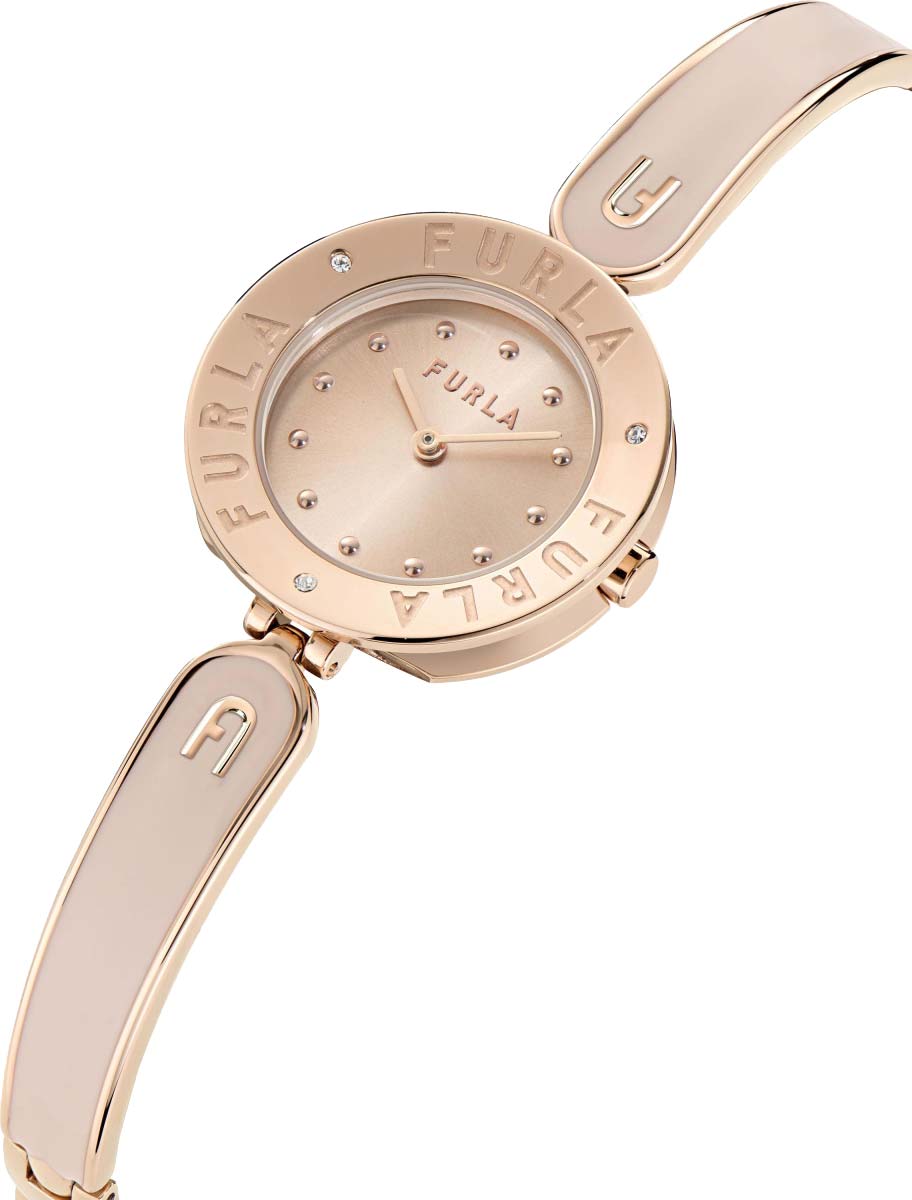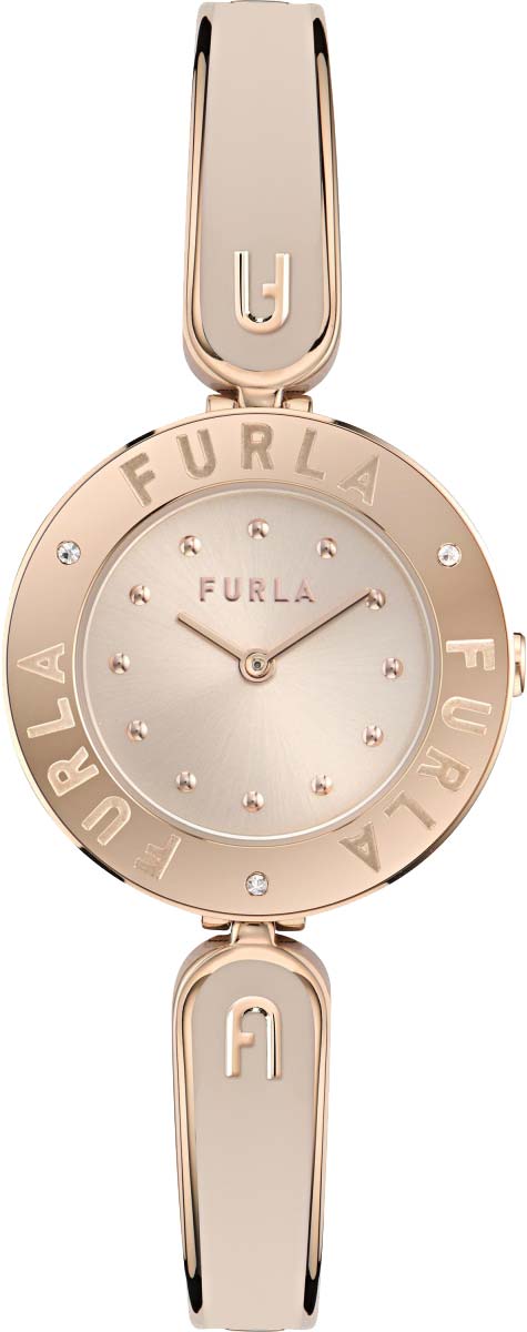 Дизайнерские наручные часы. Круглый стальной корпус. Безель с гравировками логотипа и тремя кристаллами. Циферблат с накладными метками в виде точек выполнен по технологии Sunray (солнечные лучи). Закругленные прямоугольные стрелки в стиле Baton. Заводная головка украшена фирменной аркой Furla. Надежный стальной браслет с раскладывающейся застежкой.