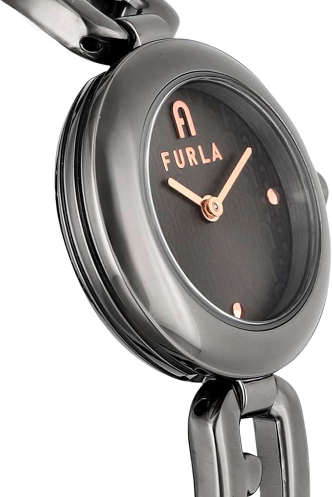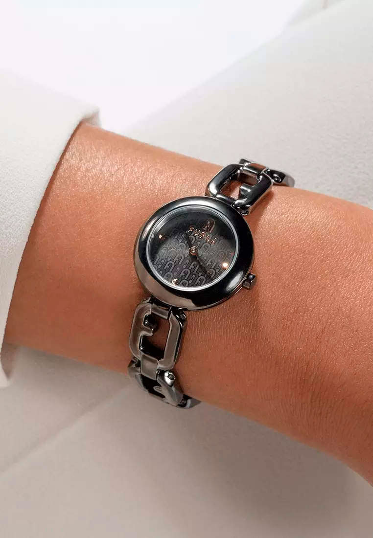 Элегантные и изящные наручные часики для модной девушки, ценящей время и неповторимый стиль. Женские часы Arco Chain. Круглый стальной полированный корпус. Циферблат украшен гравировкой с логотипом Furla. Метки в виде точек с фирменной аркой в положении 12 часов. Закругленные стрелки. Гладкая заводная головка с фирменной аркой Furla. Стальной браслет с ювелирной застежкой.