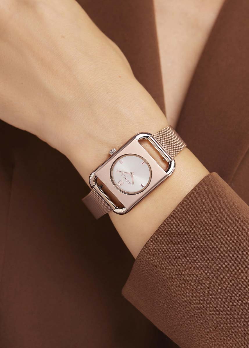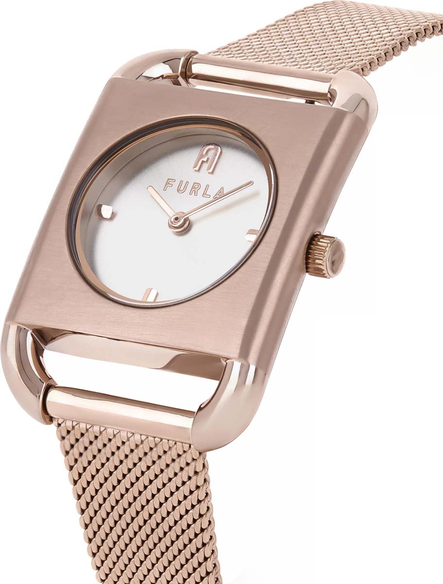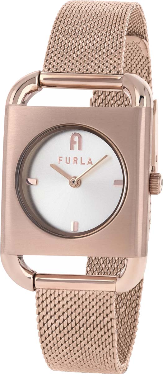 Дизайнерские кварцевые часы Arco Square. Квадратный стальной корпус. Циферблат с накладными метками в виде штрихов с фирменной аркой в положении 12 часов. Закругленные прямоугольные стрелки в стиле Baton. Рифленая заводная головка с фирменной аркой Furla. Надежный и удобный стальной браслет миланского плетения с регулируемой застежкой.