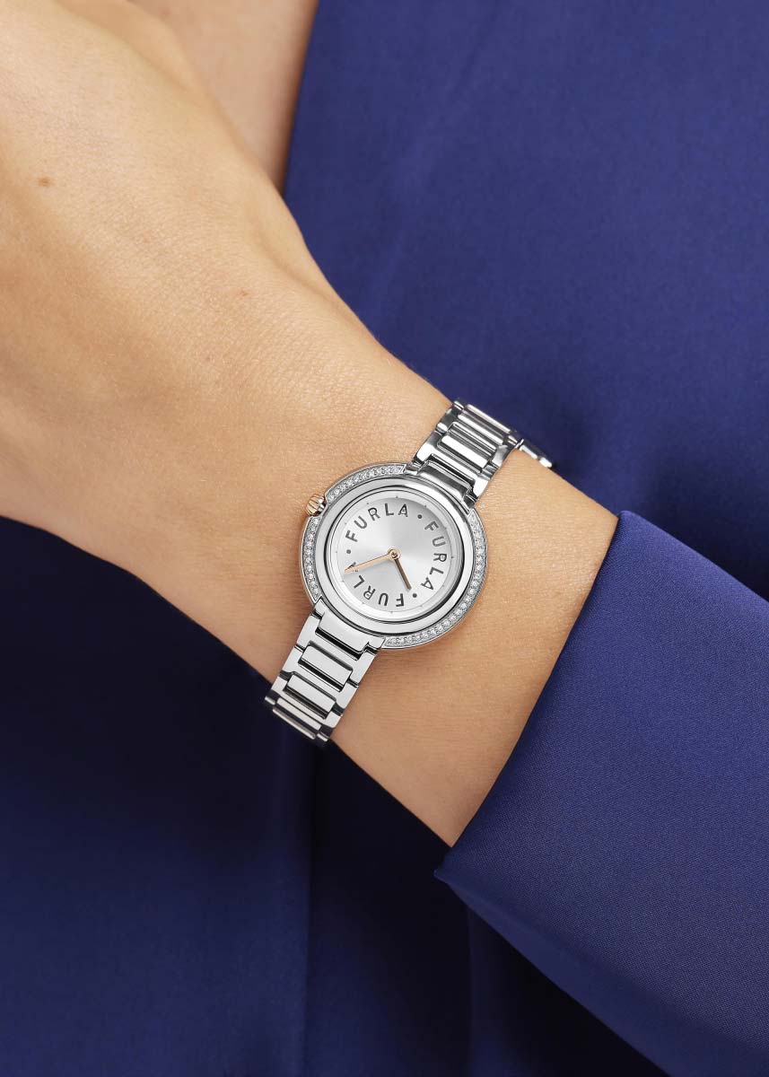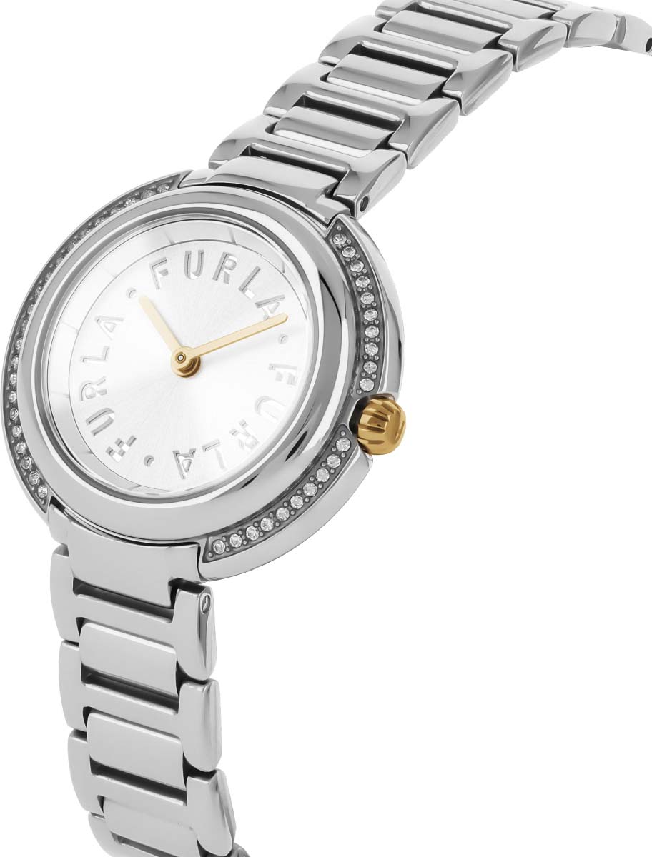 Кварцевые женские часы Icon Shape 29. Многоуровневый стальной корпус украшен паве из кристаллов. Циферблат с тремя выгравированными по кругу логотипами FURLA выполнен по технологии Sunray (солнечные лучи). Закругленные прямоугольные стрелки в стиле Baton. Рифленая заводная головка с узнаваемой фирменной аркой. Завинчивающаяся задняя крышка. Надежный стальной браслет с раскладывающейся застежкой.