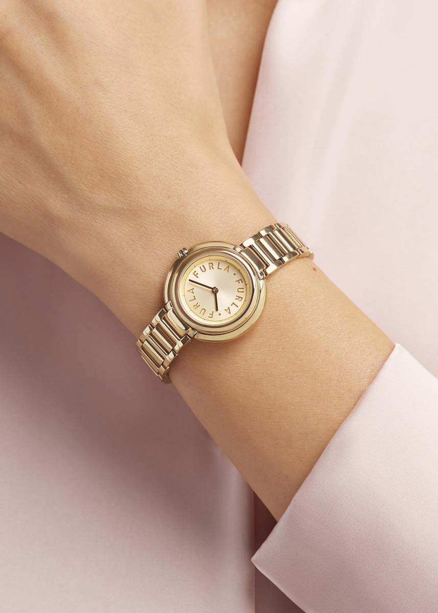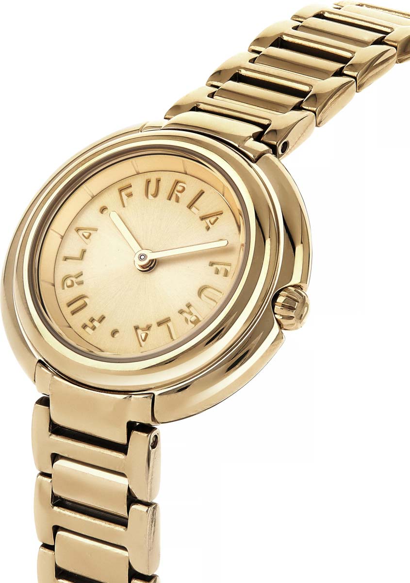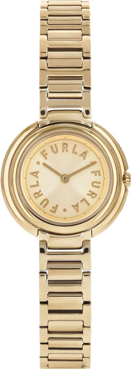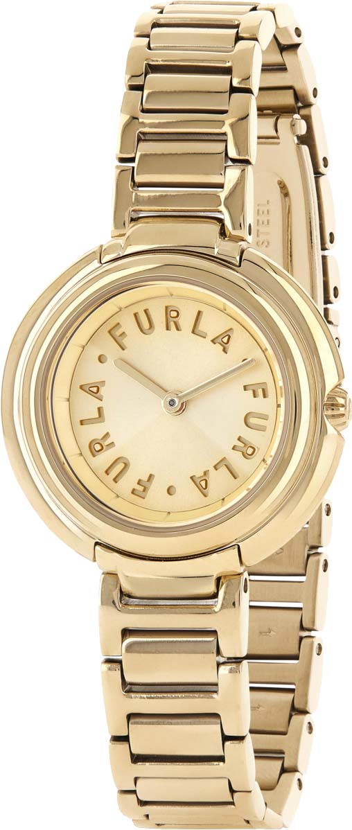 Кварцевые женские часы Icon Shape 29. Многоуровневый стальной корпус. Циферблат с тремя выгравированными по кругу логотипами FURLA выполнен по технологии Sunray (солнечные лучи). Закругленные прямоугольные стрелки в стиле Baton. Рифленая заводная головка с узнаваемой фирменной аркой. Завинчивающаяся задняя крышка. Надежный стальной браслет с раскладывающейся застежкой.