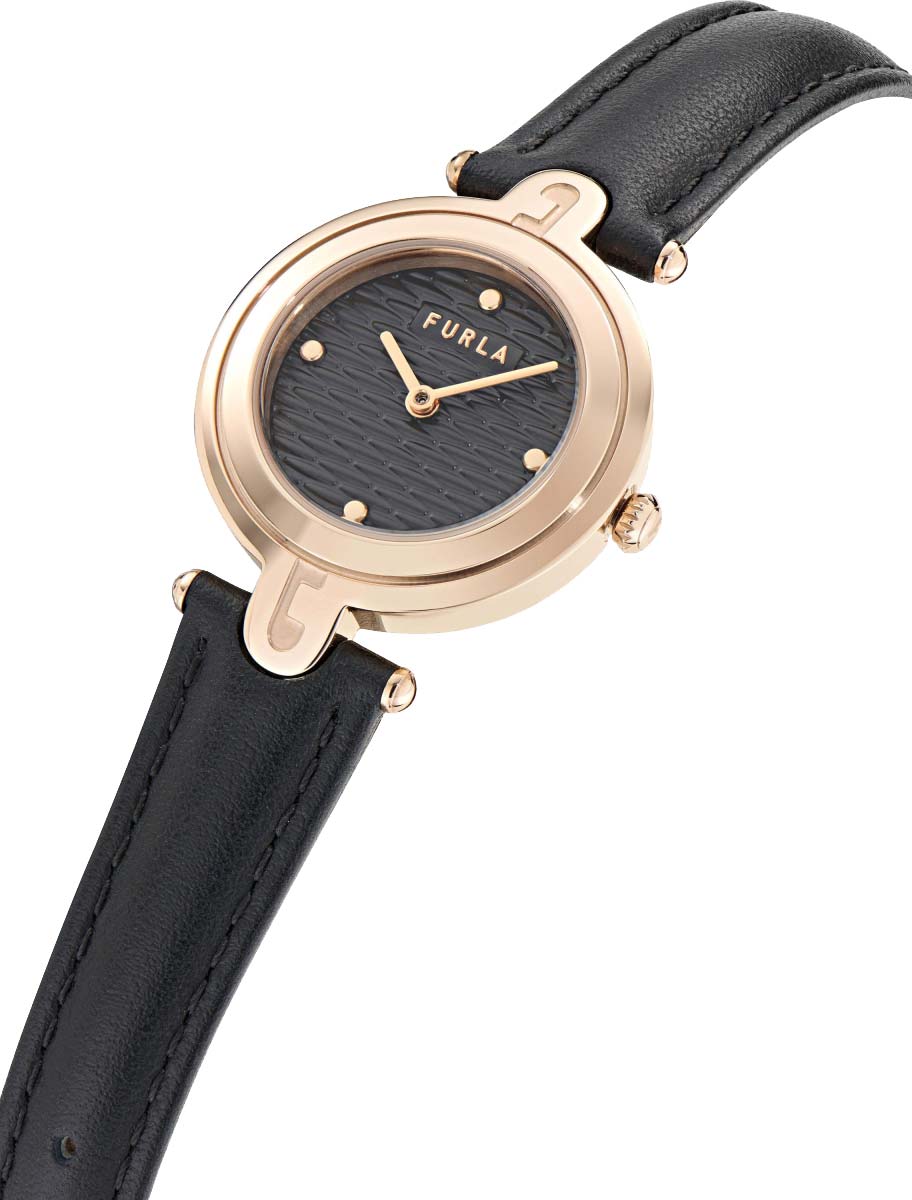 Женские кварцевые наручные часы Arch-Bar 28. Круглый стальной корпус. Текстурированный циферблат с накладными метками в виде точек. Закругленные прямоугольные стрелки в стиле Baton. Заводная головка украшена фирменной аркой Furla. Кожаный ремешок с классической застежкой.