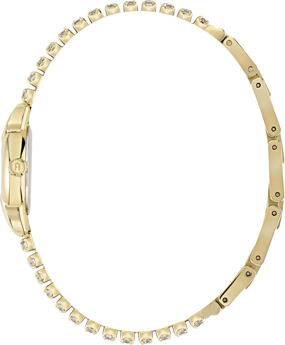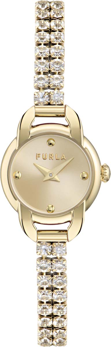 Женские наручные часы Mini Shape. Круглый стальной корпус. Циферблат с накладными метками в виде точек выполнен по технологии Sunray (солнечные лучи). Клиновидные стрелки в стиле Dauphine. Рифленая заводная головка с фирменной аркой Furla. Надежный стальной браслет с вставками из кристаллов, с раскладывающейся застежкой.