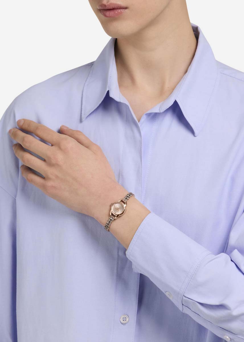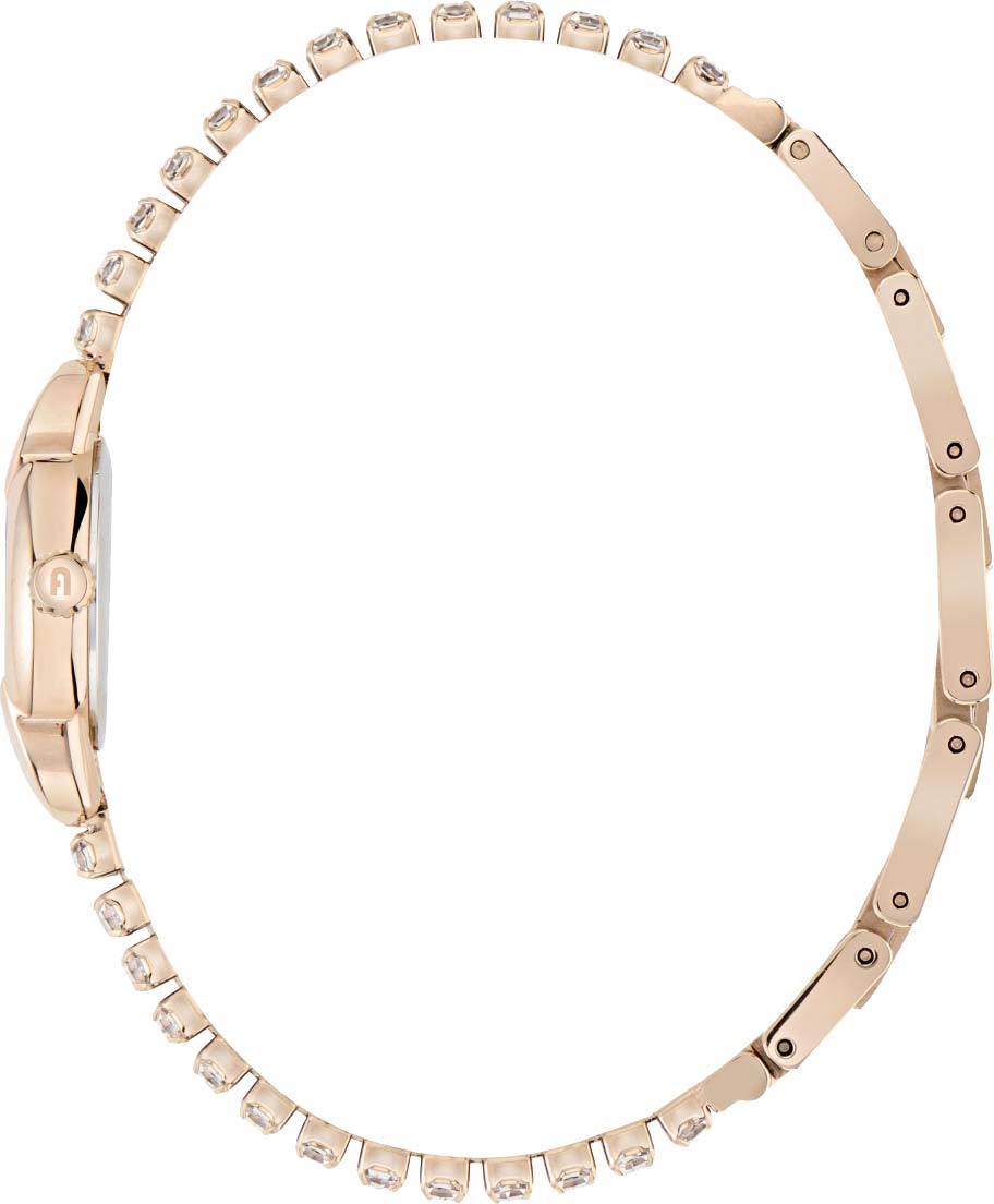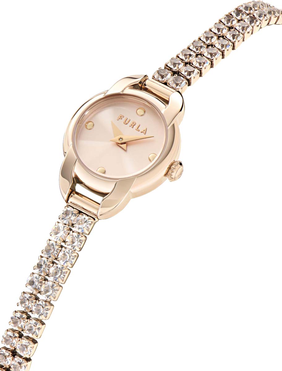 Женские наручные часы Mini Shape. Круглый стальной корпус. Циферблат с накладными метками в виде точек выполнен по технологии Sunray (солнечные лучи). Клиновидные стрелки в стиле Dauphine. Рифленая заводная головка с фирменной аркой Furla. Надежный стальной браслет с вставками из кристаллов, с раскладывающейся застежкой.