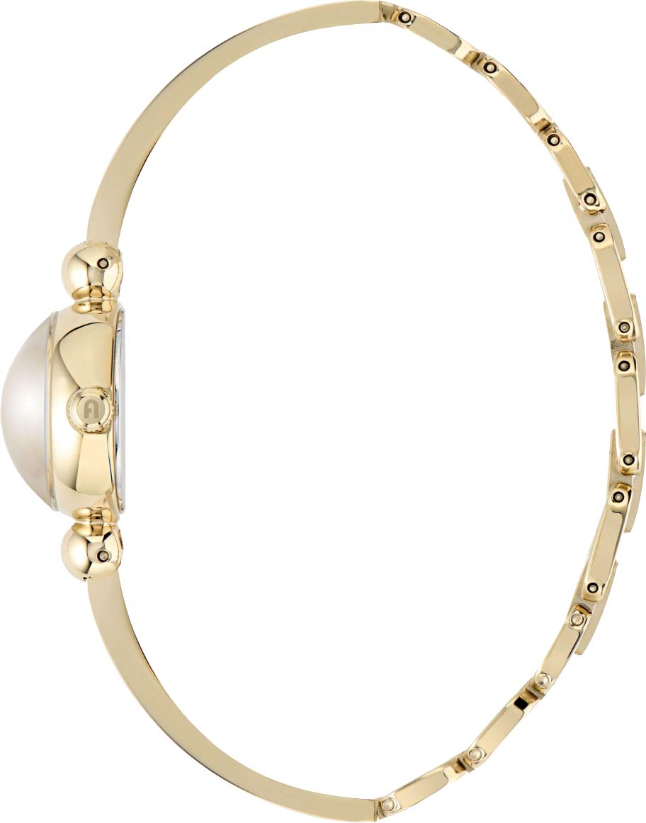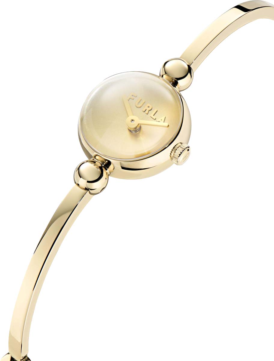 Дизайнерские женские часы Bangle. Круглый стальной корпус. Циферблат без меток выполнен по технологии Sunray (солнечные лучи) и защищен выпуклым минеральным стеклом. Рифленая заводная головка с фирменной аркой Furla. Надежный стальной браслет с раскладывающейся застежкой.