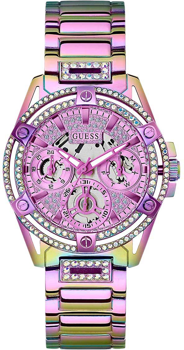 Queen. Скелетонизированные женские часы. 12-ти и 24-х часовой формат времени, дата и день недели вынесены на отдельные циферблаты. Метки в виде штрихов. Рифленая заводная головка с защитой. Браслет с раскладывающейся застежкой.