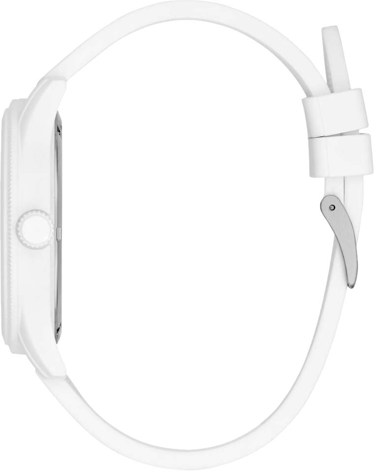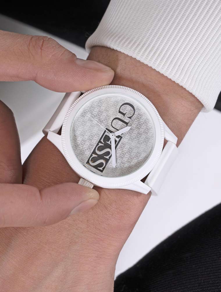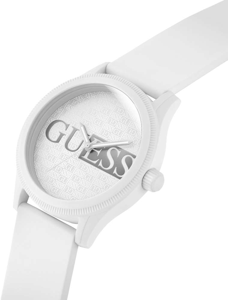 Удобный аксессуар белого цвета с легкостью дополнит любой молодежный образ. Мужские часы с круглым корпусом из пластика. Рифленый безель. Циферблат украшен логотипом Guess и защищен прочным минеральным стеклом. Рифленая заводная головка. Силиконовый ремешок с классической застежкой.