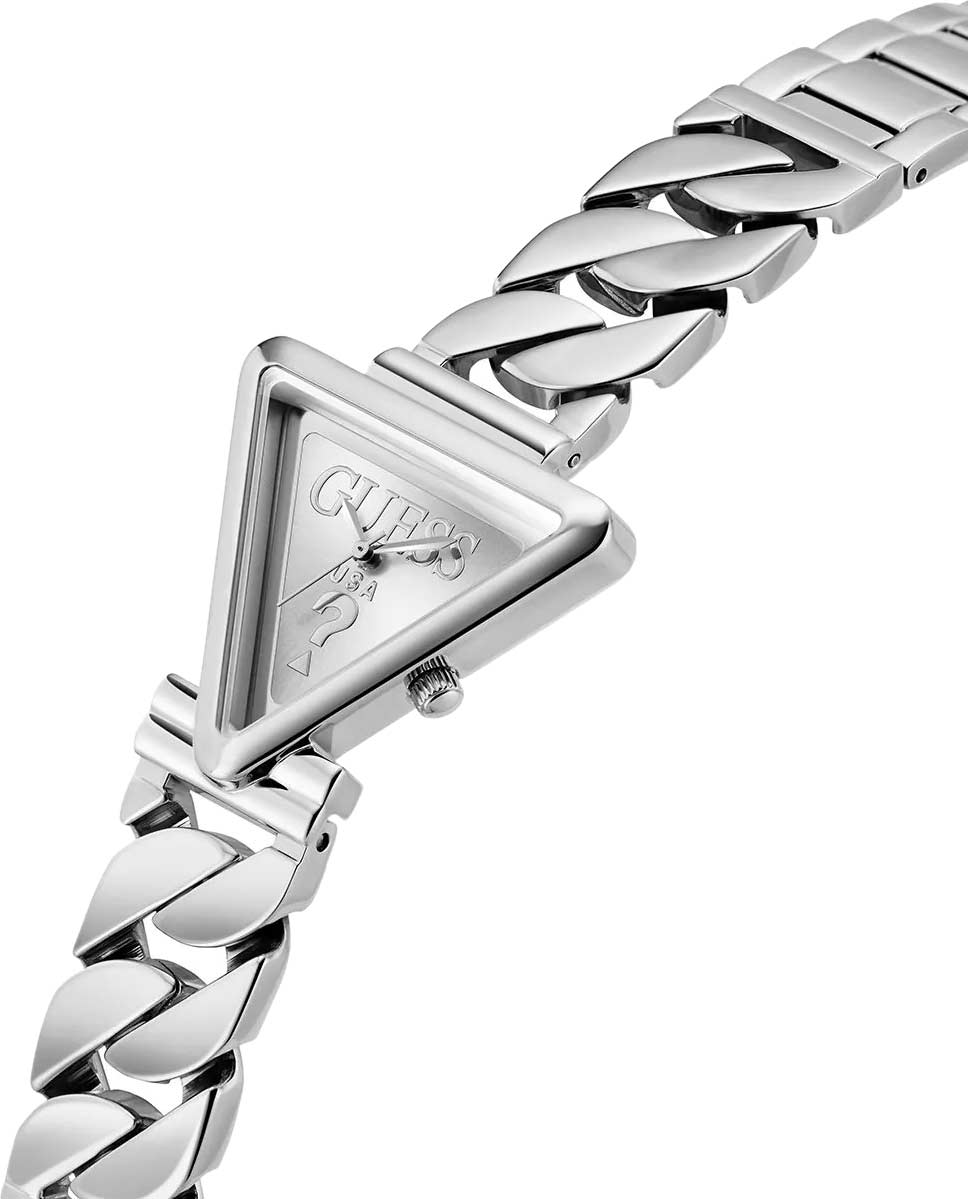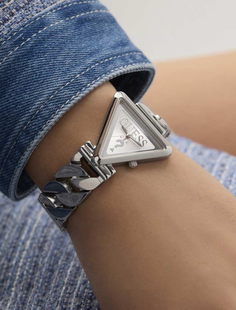 Женские наручные часы. Треугольный стальной корпус. Циферблат без меток выполнен по технологии Sunray (солнечные лучи). Рифленая заводная головка. Удобный стальной браслет в виде цепи.