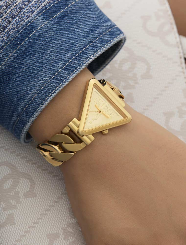 Женские наручные часы. Треугольный стальной корпус. Циферблат без меток выполнен по технологии Sunray (солнечные лучи). Рифленая заводная головка. Удобный стальной браслет в виде цепи.