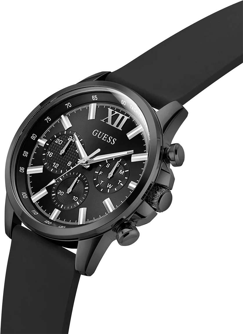 Мужские наручные часы Walker с тахиметром. 12-ти и 24-х часовой формат времени. Круглый стальной корпус. Циферблат с метками в виде штрихов. Время в 24-х часовом формате, дата и день недели вынесены на отдельные циферблаты. Рифленая заводная головка с защитой. Силиконовый ремешок с классической застежкой.