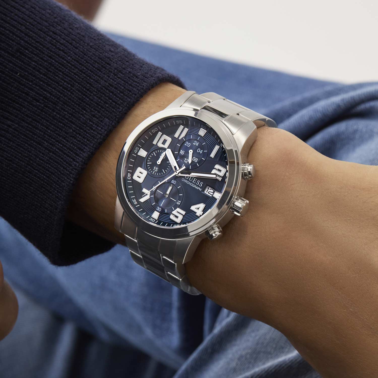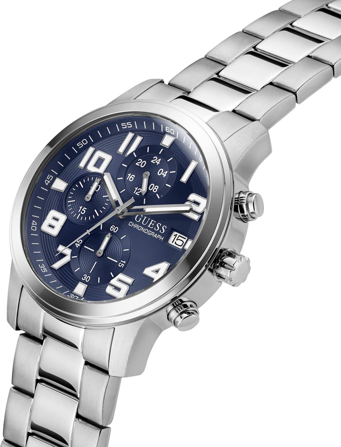 Мужские часы-хронограф с секундомером Atticus. 12-ти и 24-х часовой формат времени. Круглый стальной корпус. Циферблат с метками в виде арабских цифр и штрихов. Окошко даты находится в положении 3 часа. Рифленая заводная головка. Завинчивающаяся задняя крышка. Браслет с раскладывающейся застежкой.