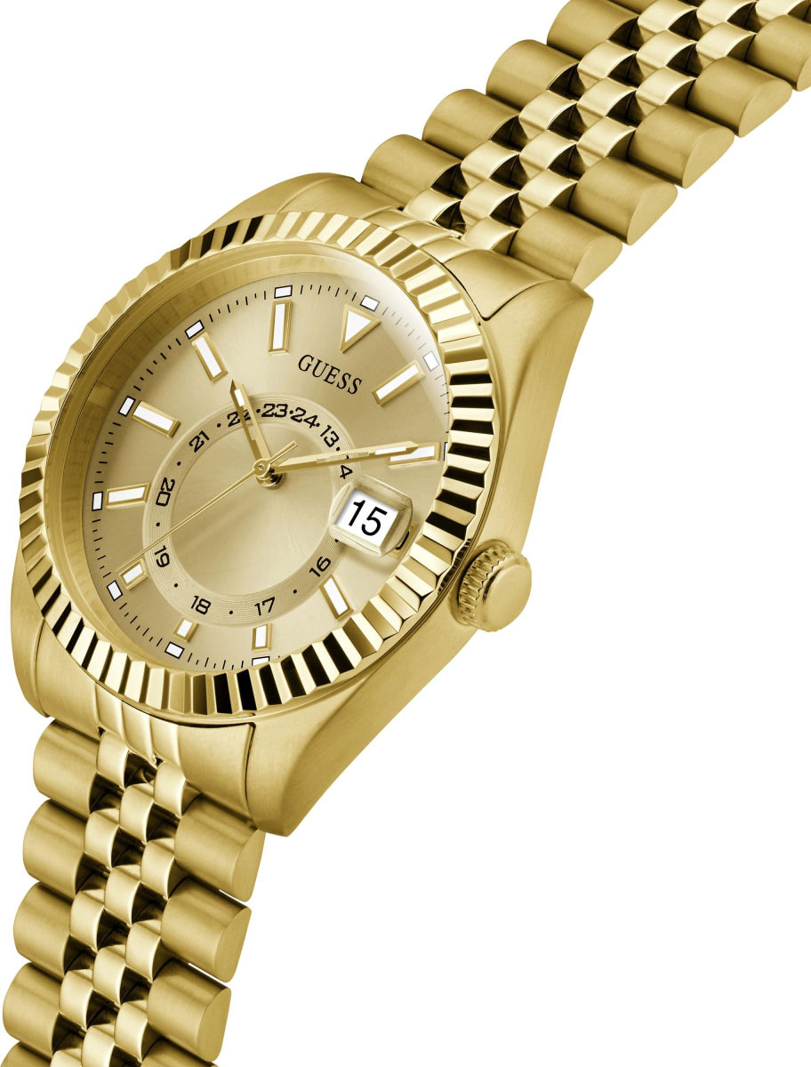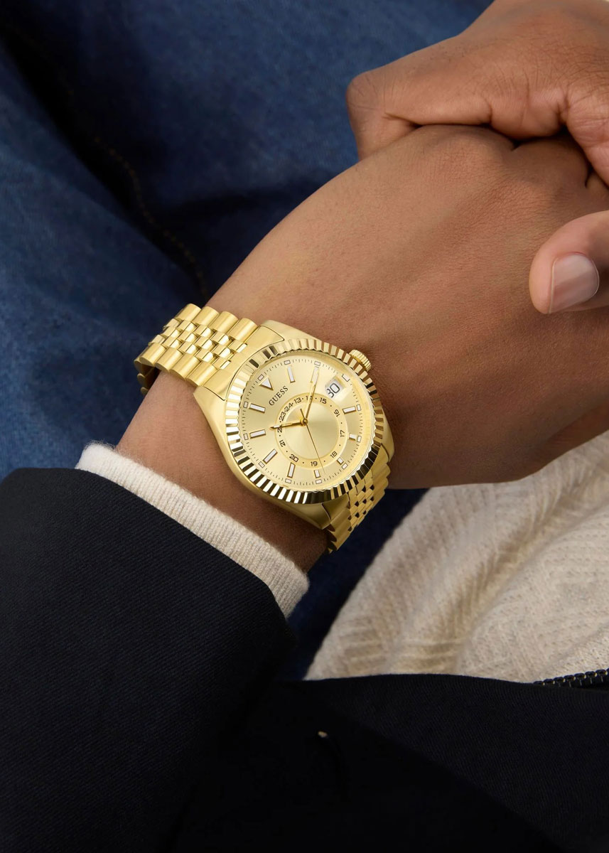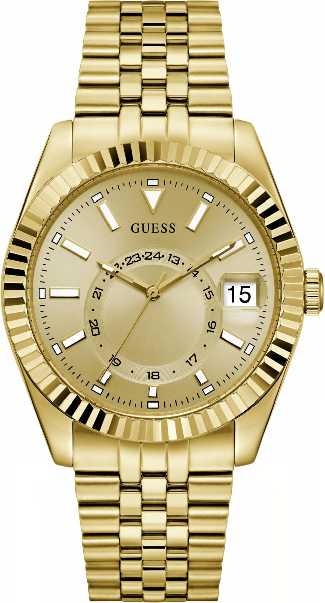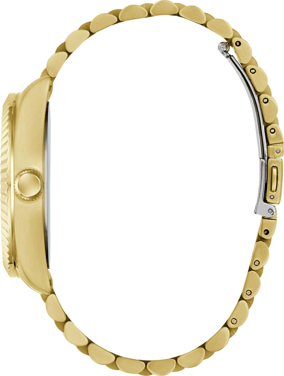 Мужские наручные часы. 12-ти и 24-х часовой формат времени. Рифленый безель. Метки в виде штрихов. Окошко даты с увеличительным стеклом в положении 3 часа. Рифленая заводная головка. Браслет с раскладывающейся застежкой.