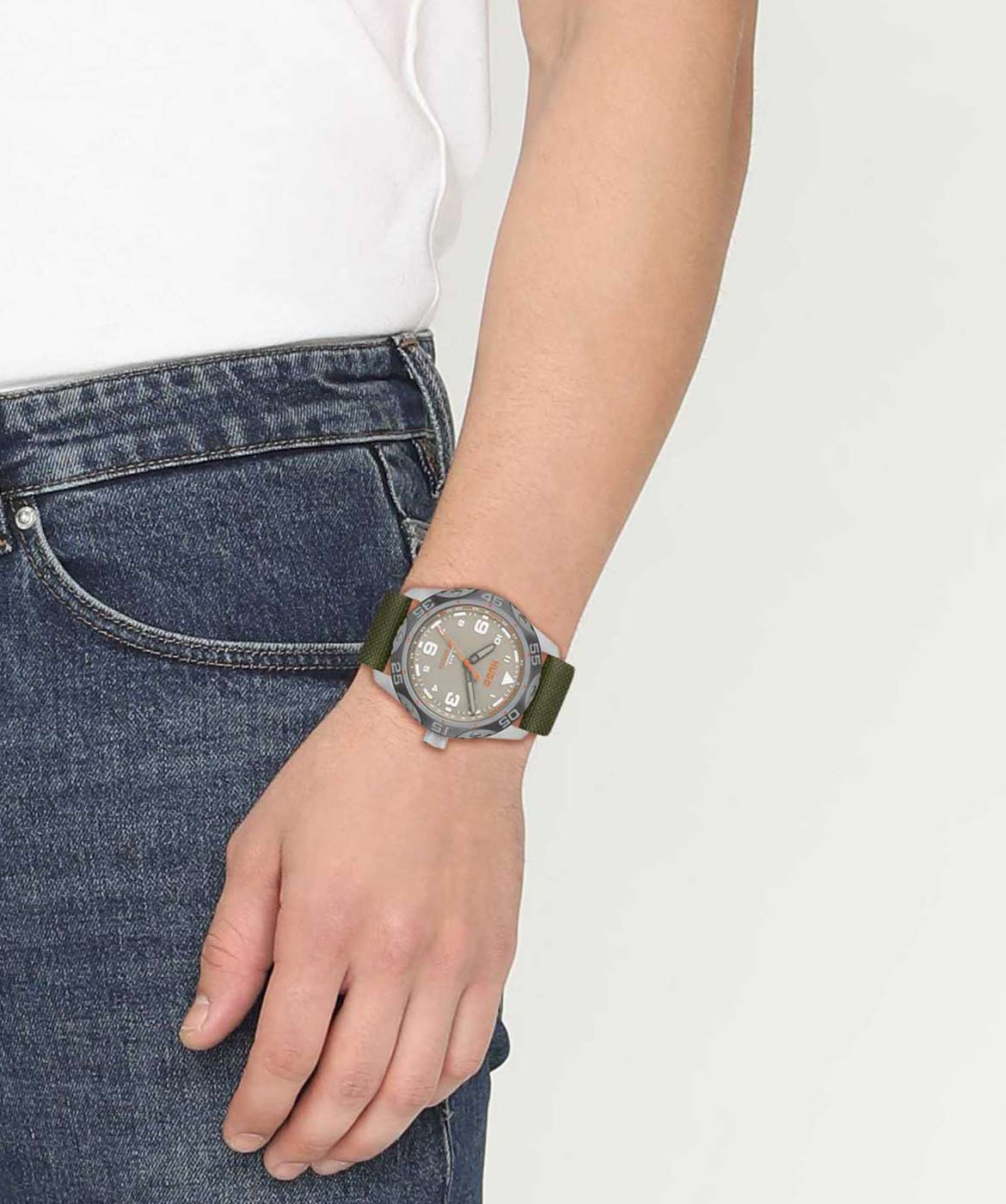 Стильный и качественный аксессуар - отличный выбор для уверенного в себе мужчины. Наручные кварцевые часы. Круглый стальной корпус. Циферблат с метками в виде арабских цифр и треугольника в положении 12 часов украшен логотипом бренда. Рифленая заводная головка. Нейлоновый ремешок с классической застежкой.
