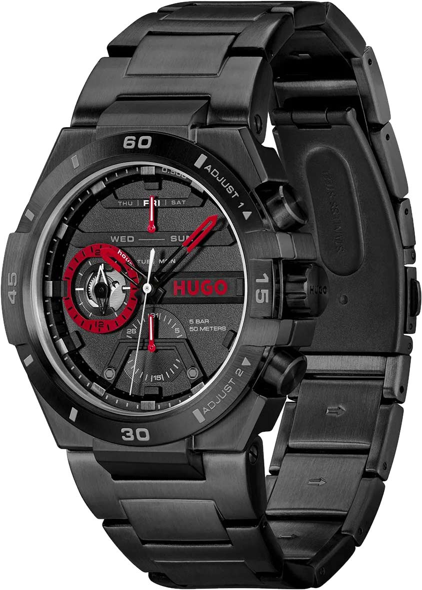 Аксессуар для вашего самовыражения. Мужские наручные часы. Круглый стальной корпус. 12-ти и 24-х часовой формат времени. Циферблат с метками в виде штрихов украшен логотипом бренда. Время в 24-х часовом формате, число и день недели вынесены на отдельные циферблаты. Рифленая заводная головка с защитой. Браслет с раскладывающейся застежкой.