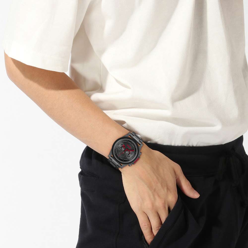 Стильный мужской аксессуар будет прекрасным партнером в вопросах времени. Наручные кварцевые часы. Круглый стальной корпус. Рифленый безель. 12-ти и 24-х часовой формат времени. Циферблат с метками в виде точек украшен логотипом бренда. Время в 24-х часовом формате, число и день недели вынесены на отдельные циферблаты. Браслет с раскладывающейся застежкой.